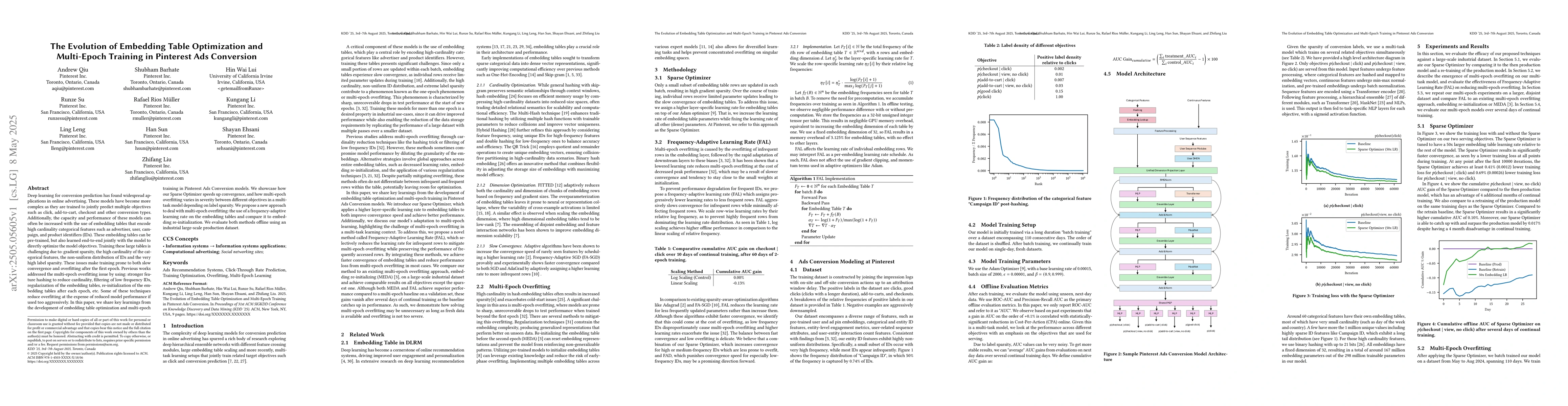 This paper explores techniques to optimize embedding tables and multi-epoch training in Pinterest Ads conversion models, addressing issues of slow convergence and overfitting, and proposing a new approach using frequency-adaptive learning rates.