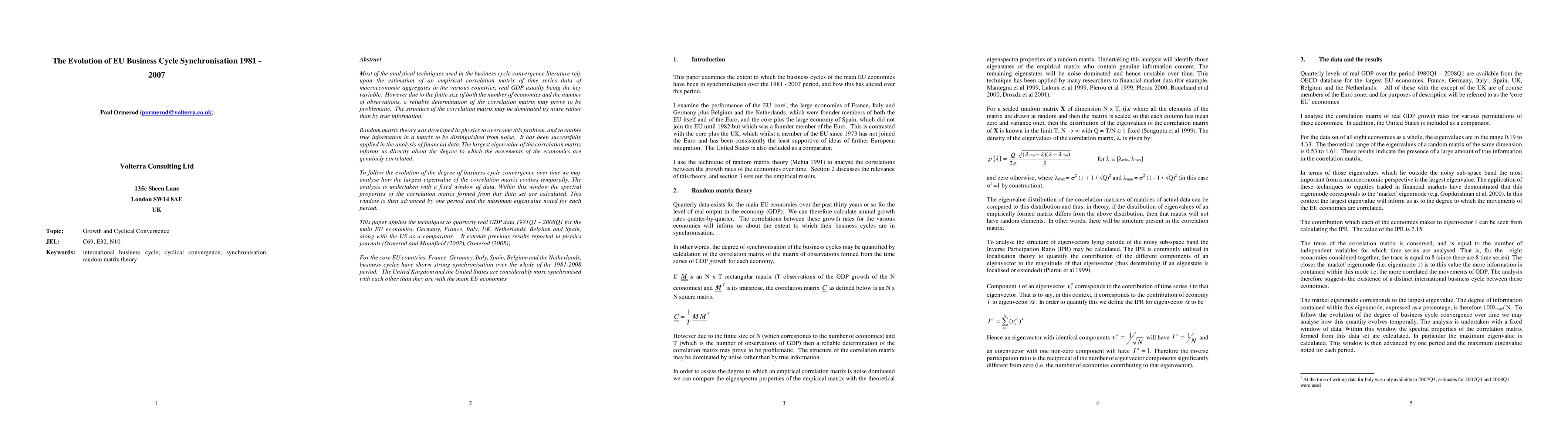 This paper uses random matrix theory to analyze the evolution of business cycle synchronisation among core EU economies from 1981 to 2007. It finds strong synchronisation within the core EU economies, while the UK and US show greater synchronisation with each other than with the core EU economies.