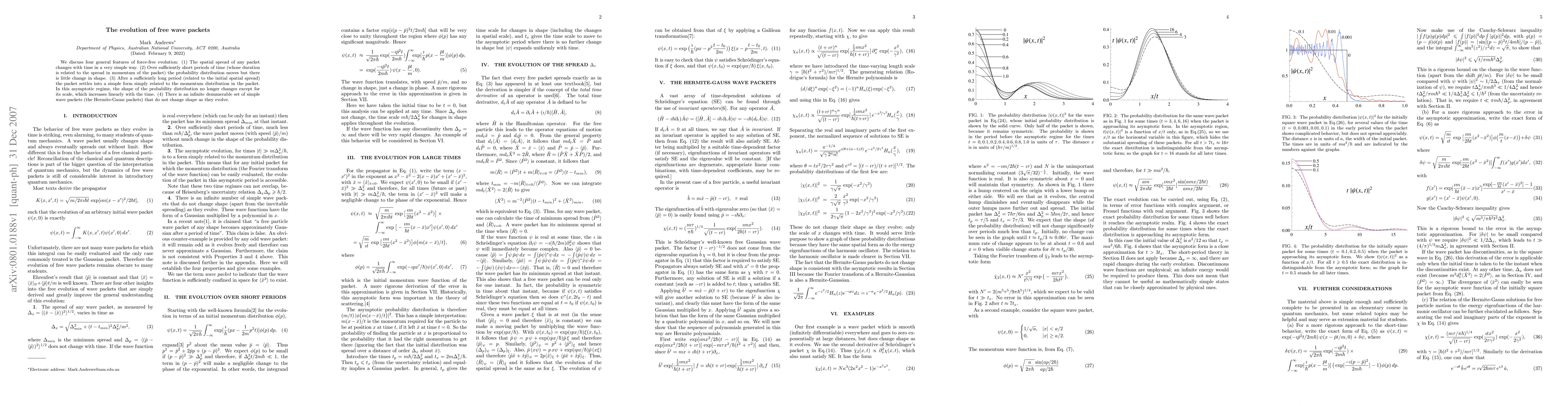 We discuss four general features of force-free evolution: (1) The spatial spread of any packet changes with time in a very simple way. (2) Over sufficiently short periods of time (whose duration is related to the spread in momentum of the packet) the probability distribution moves but there is little change in shape. (3) After a sufficiently long period (related to the initial spatial spread) the packet settles into a simple form simply related to the momentum distribution in the packet. In this asymptotic regime, the shape of the probability distribution no longer changes except for its scale, which increases linearly with the time. (4) There is an infinite denumerable set of simple wave packets (the Hermite-Gauss packets) that do not change shape as they evolve.