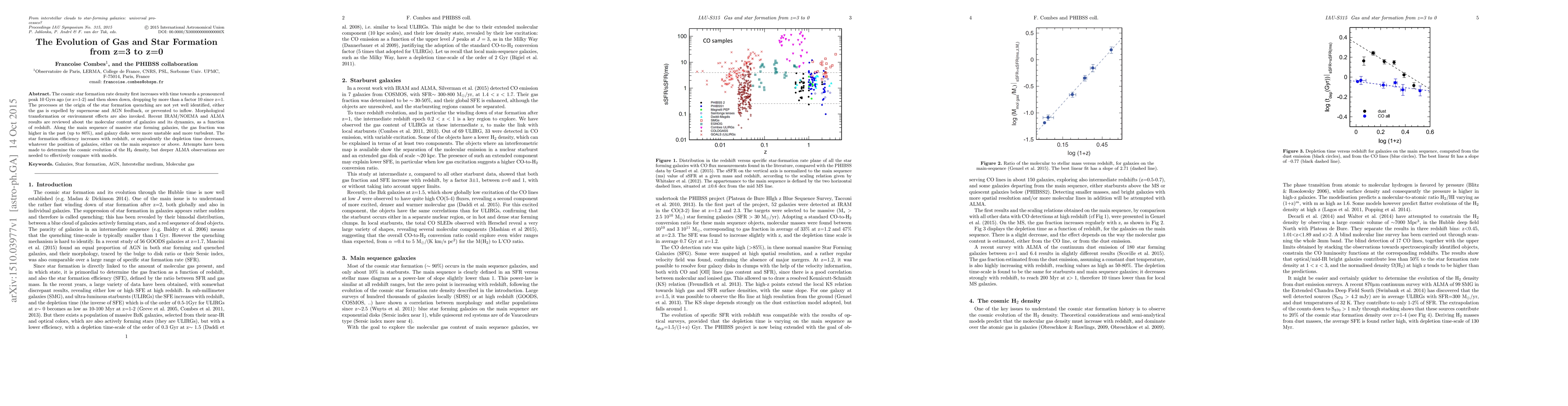 This paper reviews the evolution of gas and star formation from redshift z=3 to z=0, noting a peak in cosmic star formation rate density 10 Gyrs ago, followed by a significant decline. It discusses the mechanisms behind star formation quenching and highlights the higher gas fractions and more turbulent galaxy disks in the past, along with an increasing star formation efficiency with higher redshift.