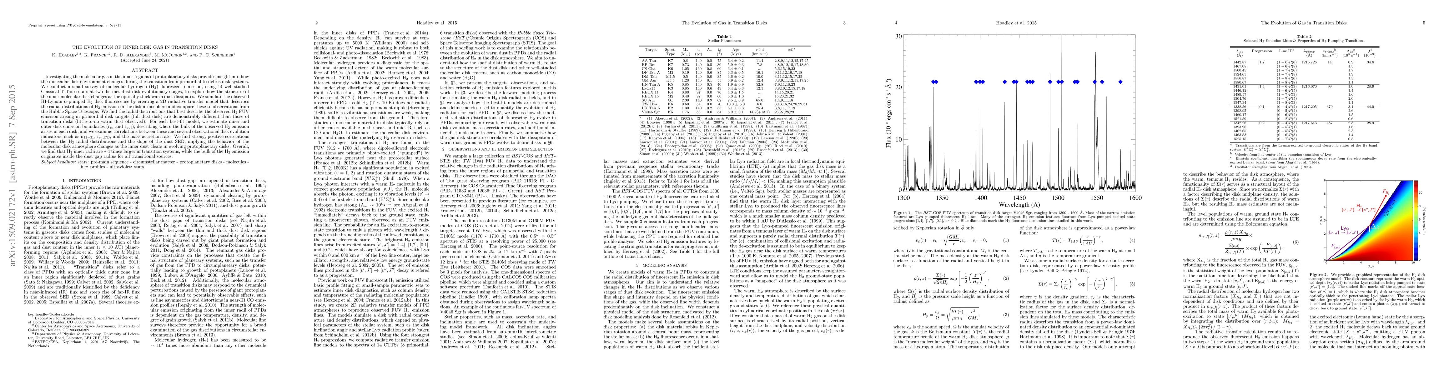 This study investigates the evolution of molecular gas in the inner regions of protoplanetary disks, comparing H$_2$ fluorescent emission in Classical T Tauri stars at different evolutionary stages. The findings reveal significant differences in H$_2$ radial distributions between primordial and transition disks, with H$_2$ inner radii being approximately four times larger in transition disks.