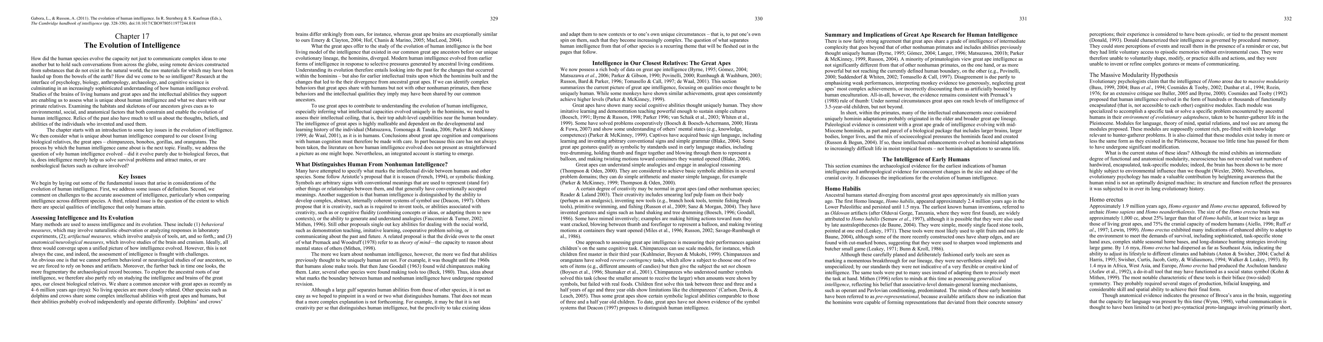 How did the human species evolve the capacity not just to communicate complex ideas to one another but to hold such conversations from across the globe, using remote devices constructed from substances that do not exist in the natural world, the raw materials for which may have been hauled up from the bowels of the earth? How did we come to be so intelligent? Research at the interface of psychology, biology, anthropology, archaeology, and cognitive science is culminating in an increasingly sophisticated understanding of how human intelligence evolved. Studies of the brains of living humans and great apes and the intellectual abilities they support are enabling us to assess what is unique about human intelligence and what we share with our primate relatives. Examining the habitats and skeletons of our ancestors gives cues as to environmental, social, and anatomical factors that both constrain and enable the evolution of human intelligence. Relics of the past also have much to tell us about the thoughts, beliefs, and abilities of the individuals who invented and used them.
