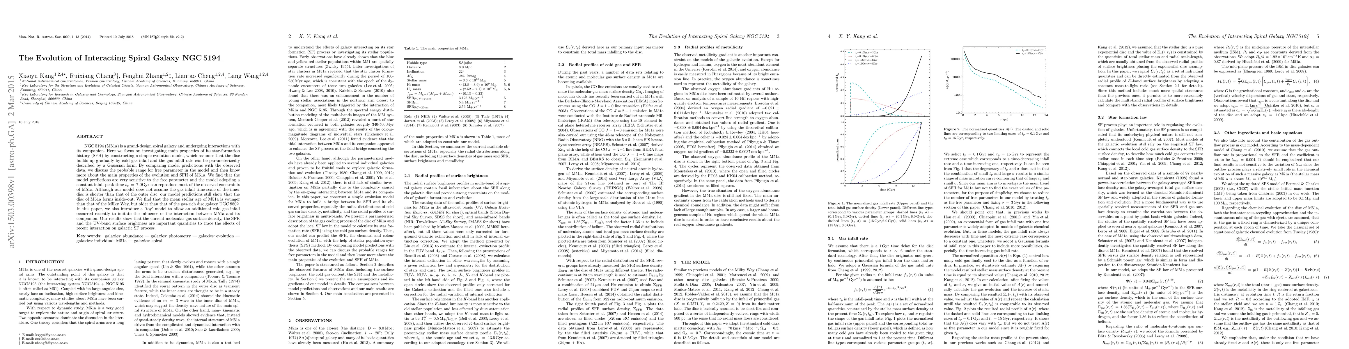 NGC 5194 (M51a) is a grand-design spiral galaxy and undergoing interactions with its companion. Here we focus on investigating main properties of its star-formation history (SFH) by constructing a simple evolution model, which assumes that the disc builds up gradually by cold gas infall and the gas infall rate can be parameterizedly described by a Gaussian form. By comparing model predictions with the observed data, we discuss the probable range for free parameter in the model and then know more about the main properties of the evolution and SFH of M51a. We find that the model predictions are very sensitive to the free parameter and the model adopting a constant infall-peak time $t_{\rm p}\,=\,7.0{\rm Gyr}$ can reproduce most of the observed constraints of M51a. Although our model does not assume the gas infall time-scale of the inner disc is shorter than that of the outer disc, our model predictions still show that the disc of M51a forms inside-out. We find that the mean stellar age of M51a is younger than that of the Milky Way, but older than that of the gas-rich disc galaxy UGC 8802. In this paper, we also introduce a 'toy' model to allow an additional cold gas infall occurred recently to imitate the influence of the interaction between M51a and its companion. Our results show that the current molecular gas surface density, the SFR and the UV-band surface brightness are important quantities to trace the effects of recent interaction on galactic SF process.