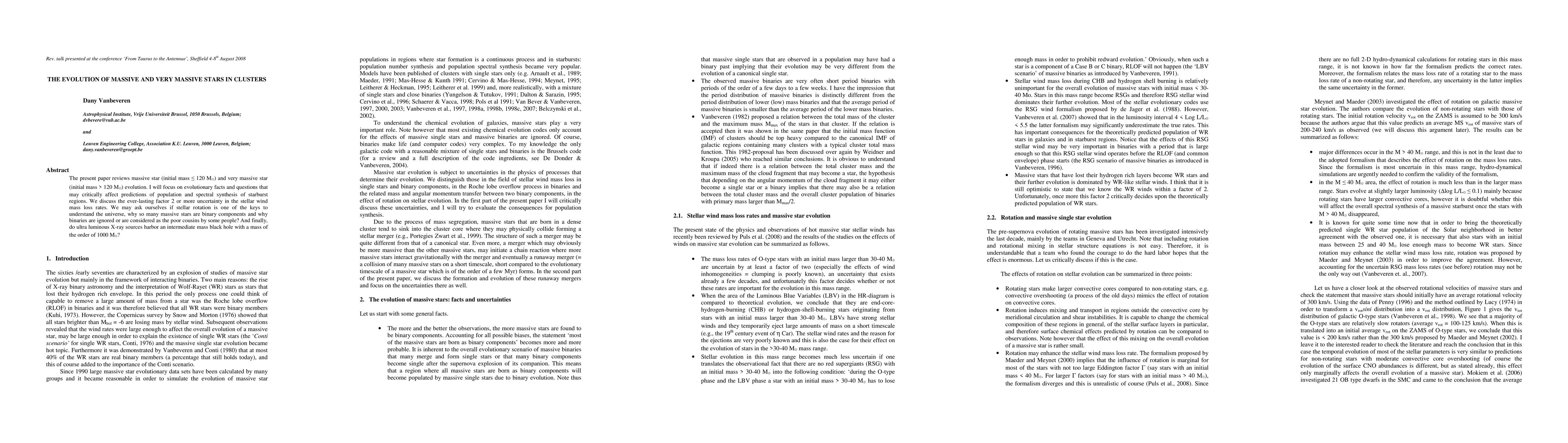 The present paper reviews massive star (initial mass smaller than 120 M0) and very massive star (initial mass larger than 120 M0) evolution. I will focus on evolutionary facts and questions that may critically affect predictions of population and spectral synthesis of starburst regions. We discuss the ever-lasting factor 2 or more uncertainty in the stellar wind mass loss rates. We may ask ourselves if stellar rotation is one of the keys to understand the universe, why so many massive stars are binary components and why binaries are ignored or are considered as the poor cousins by some people? And finally, do ultra luminous X-ray sources harbor an intermediate mass black hole with a mass of the order of 1000 M0?