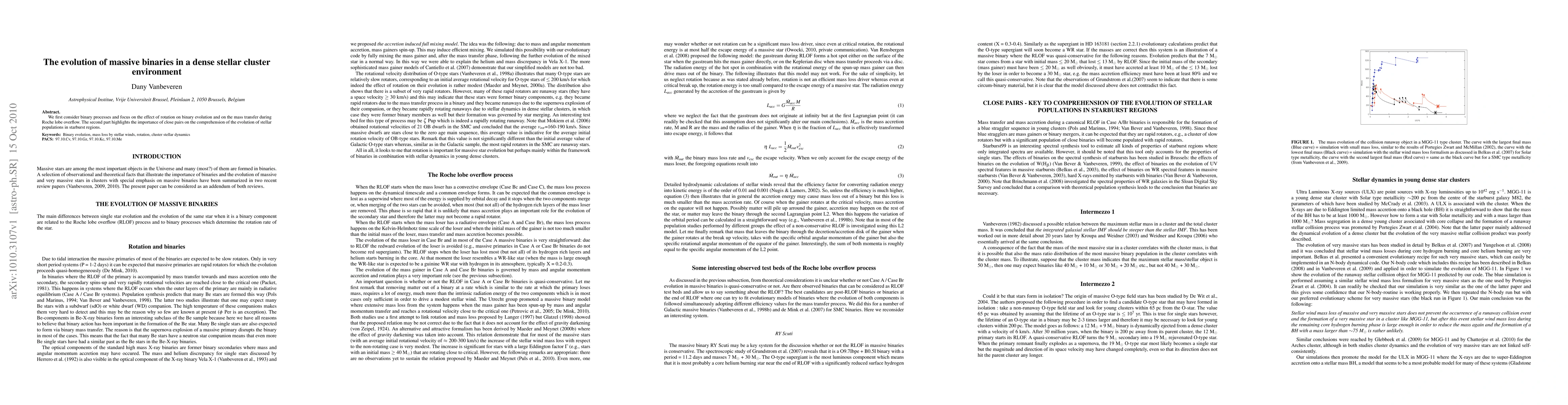 Massive stars are among the most important objects in the Universe and many (most?) of them are formed in binaries. A selection of observational and theoretical facts that illustrate the importance of binaries and the evolution of massive and very massive stars in clusters with special emphasis on massive binaries have been summarized in two recent review papers (Vanbeveren, 2009, 2010). The present paper can be considered as an addendum of both reviews.