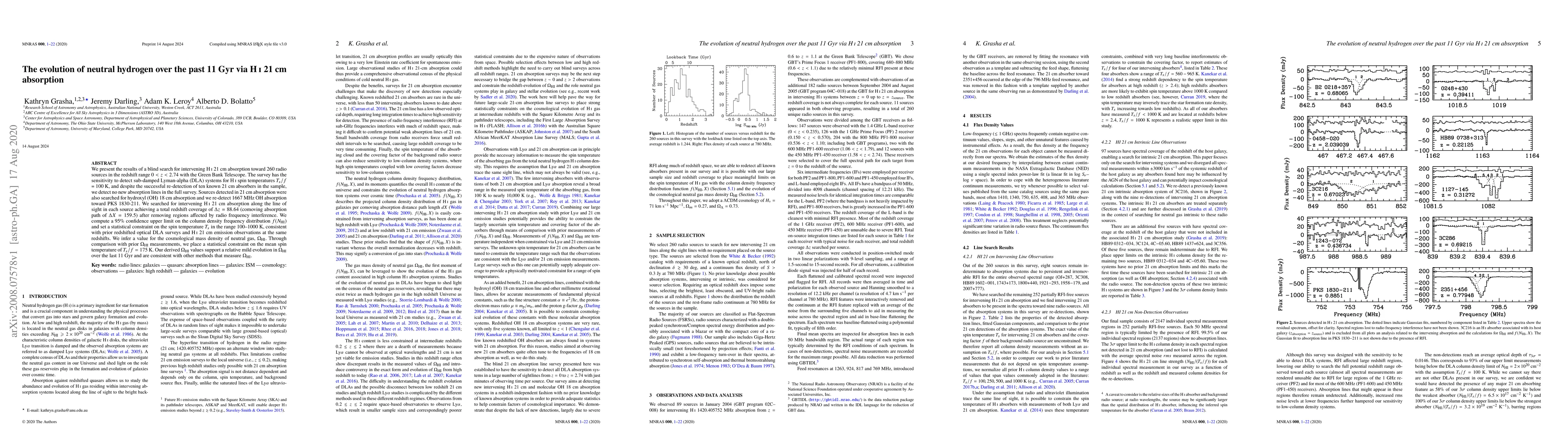 This study uses HI 21 cm absorption to survey neutral hydrogen evolution over the past 11 Gyr, detecting no new absorption lines but re-detecting ten known systems. The results provide a statistical constraint on the mean spin temperature and support a mild evolution in the cosmological mass density of neutral gas over this period.