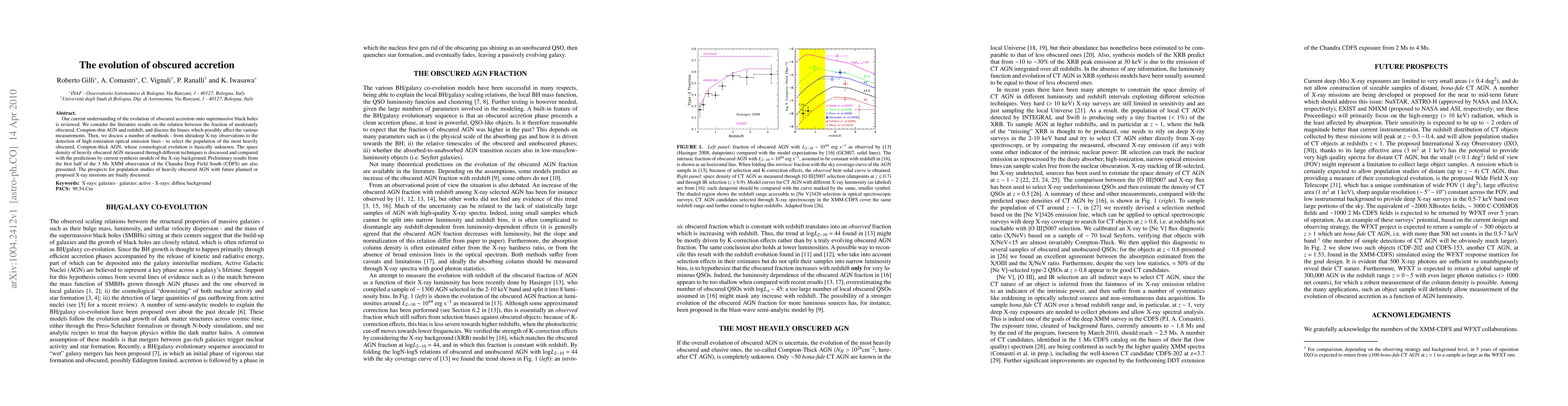 This paper reviews the evolution of obscured accretion onto supermassive black holes, examining the fraction of moderately obscured AGN relative to redshift and the biases in measurements. It discusses methods to identify heavily obscured, Compton-thick AGN and compares their space density with X-ray background models, presenting preliminary results from the CDFS XMM observation and prospects for future studies.