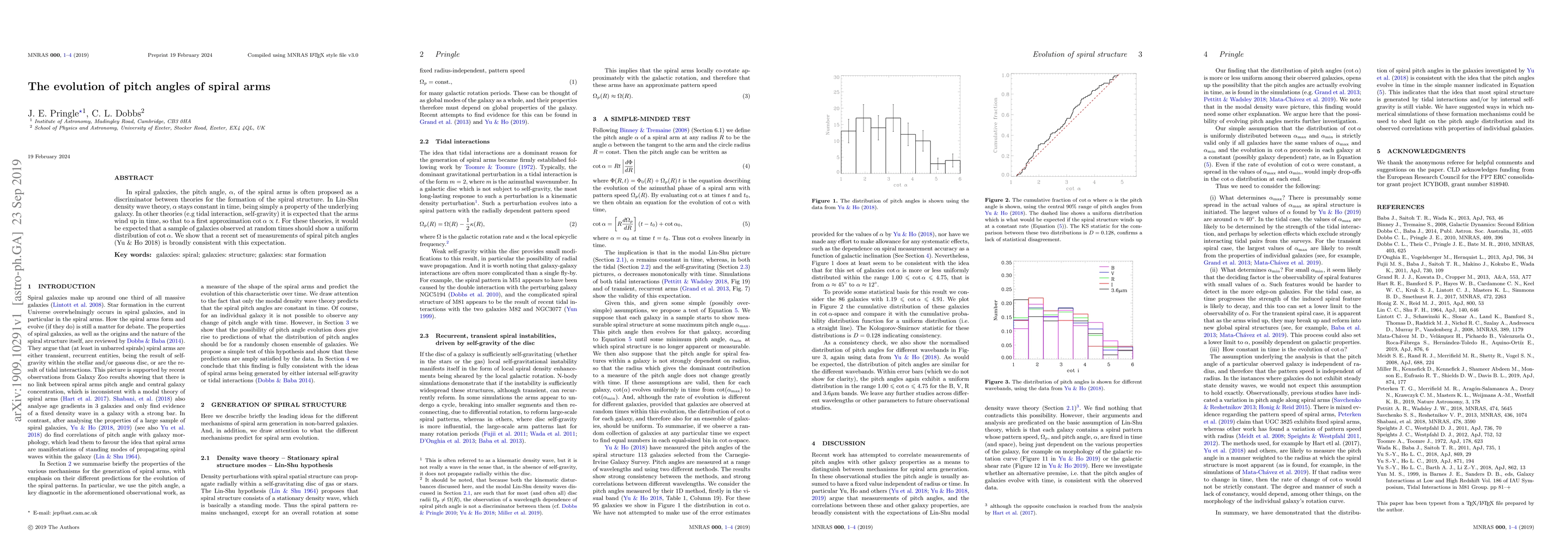 In spiral galaxies, the pitch angle, $\alpha$, of the spiral arms is often proposed as a discriminator between theories for the formation of the spiral structure. In Lin-Shu density wave theory, $\alpha$ stays constant in time, being simply a property of the underlying galaxy. In other theories (e.g tidal interaction, self-gravity) it is expected that the arms wind up in time, so that to a first approximation $\cot \alpha \propto t$. For these theories, it would be expected that a sample of galaxies observed at random times should show a uniform distribution of $\cot \alpha$. We show that a recent set of measurements of spiral pitch angles (Yu & Ho 2018) is broadly consistent with this expectation.