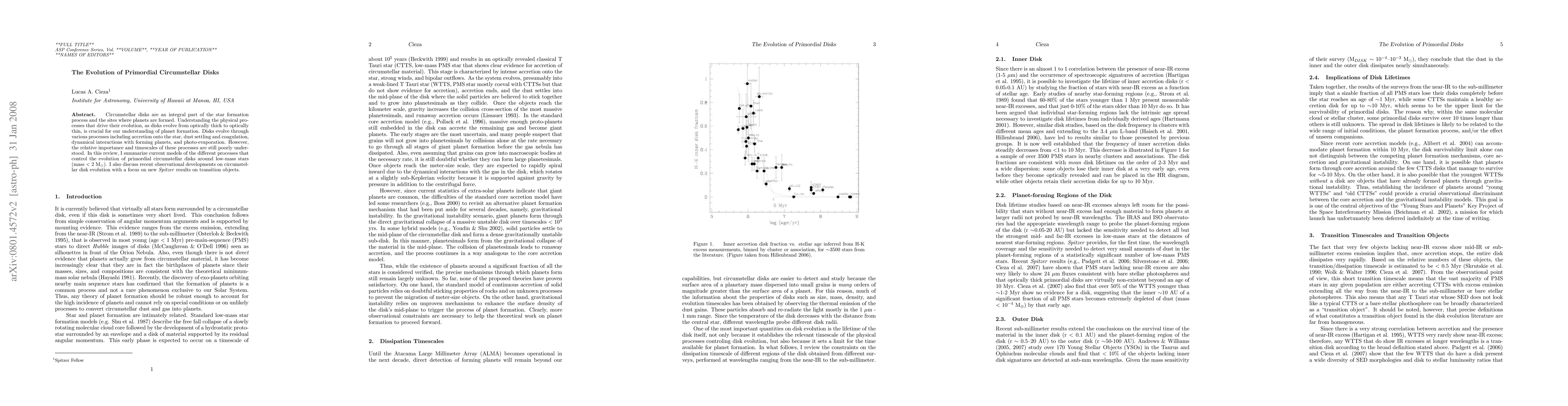 This paper reviews the processes governing the evolution of primordial circumstellar disks around low-mass stars, emphasizing accretion, dust dynamics, planet interactions, and photo-evaporation. It highlights recent observational advancements, particularly new Spitzer data on transitional disks.