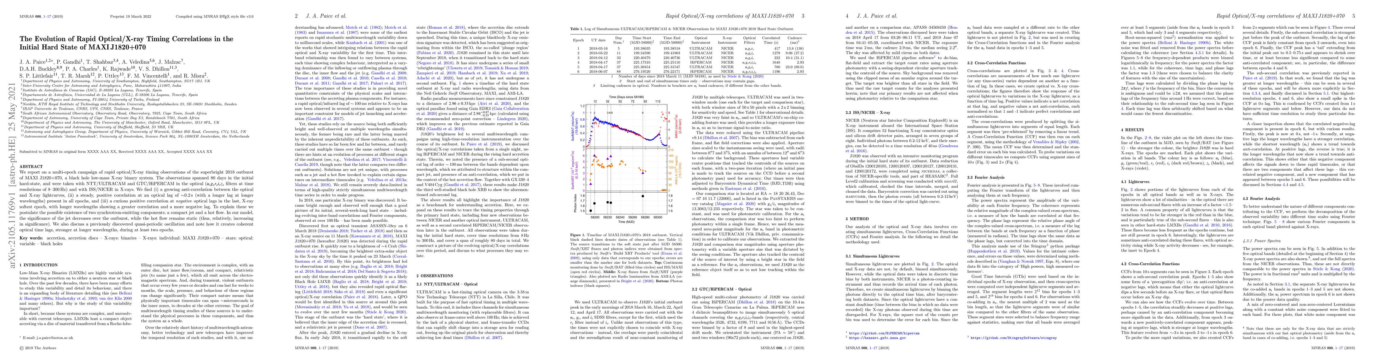 We report on a multi-epoch campaign of rapid optical/X-ray timing observations of the superbright 2018 outburst of MAXI J1820+070, a black hole low-mass X-ray binary system. The observations spanned 80 days in the initial hard-state, and were taken with NTT/ULTRACAM and GTC/HiPERCAM in the optical (ugriz filters at time resolutions of 8--300 Hz) and with ISS/NICER in X-rays. We find (i) a growing anti-correlation between the optical and X-ray lightcurves, (ii) a steady, positive correlation at an optical lag of 0.2 s (with a longer lag at longer wavelengths) present in all epochs, and (iii) a curious positive correlation at \textit{negative} optical lags in the last, X-ray softest epoch, with longer wavelengths showing a greater correlation and a more negative lag. To explain these we postulate the possible existence of two synchrotron-emitting components; a compact jet and a hot flow. In our model, the significance of the jet decreases over the outburst, while the hot flow remains static (thus, relatively, increasing in significance). We also discuss a previously discovered quasi-periodic oscillation and note how it creates coherent optical time lags, stronger at longer wavelengths, during at least two epochs.