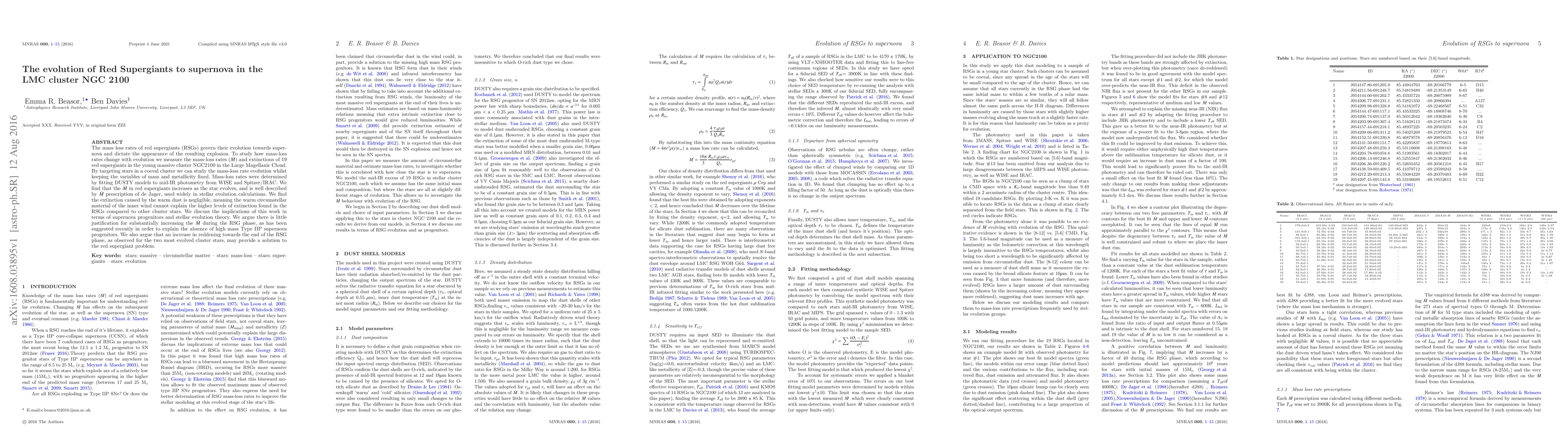 The mass loss rates of red supergiants (RSGs) govern their evolution towards supernova and dictate the appearance of the resulting explosion. To study how mass-loss rates change with evolution we measure the mass-loss rates (\mdot) and extinctions of 19 red supergiants in the young massive cluster NGC2100 in the Large Magellanic Cloud. By targeting stars in a coeval cluster we can study the mass-loss rate evolution whilst keeping the variables of mass and metallicity fixed. Mass-loss rates were determined by fitting DUSTY models to mid-IR photometry from WISE and Spitzer/IRAC. We find that the \mdot\ in red supergiants increases as the star evolves, and is well described by \mdot\ prescription of de Jager, used widely in stellar evolution calculations. We find the extinction caused by the warm dust is negligible, meaning the warm circumstellar material of the inner wind cannot explain the higher levels of extinction found in the RSGs compared to other cluster stars. We discuss the implications of this work in terms of supernova progenitors and stellar evolution theory. We argue there is little justification for substantially increasing the \mdot\ during the RSG phase, as has been suggested recently in order to explain the absence of high mass Type IIP supernova progenitors. We also argue that an increase in reddening towards the end of the RSG phase, as observed for the two most evolved cluster stars, may provide a solution to the red supergiant problem.