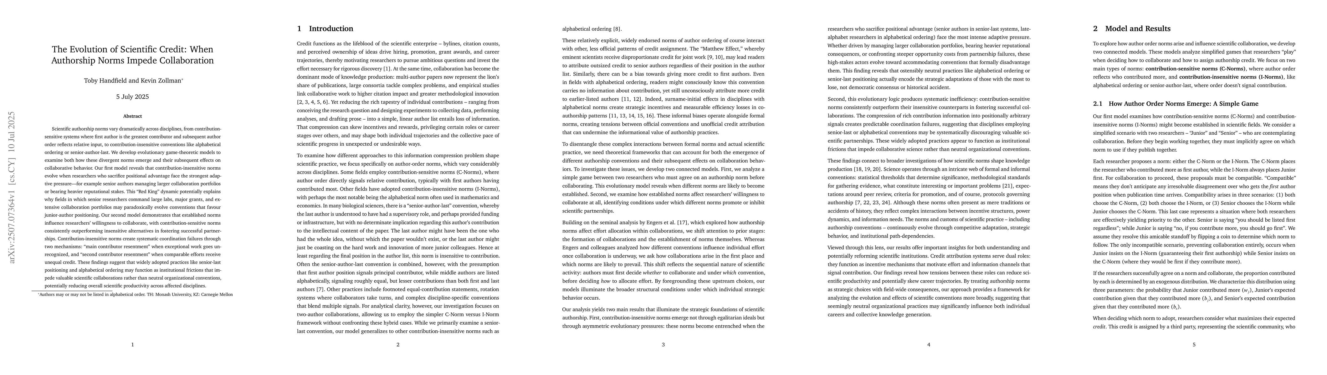 This paper uses game theory to show that contribution-insensitive authorship norms, like alphabetical ordering or senior-author-last, can create resentment and coordination failures in scientific collaborations. These norms may reduce productivity in fields with large, senior-led teams. Contribution-sensitive norms, which credit authors based on their input, foster better collaborations.
