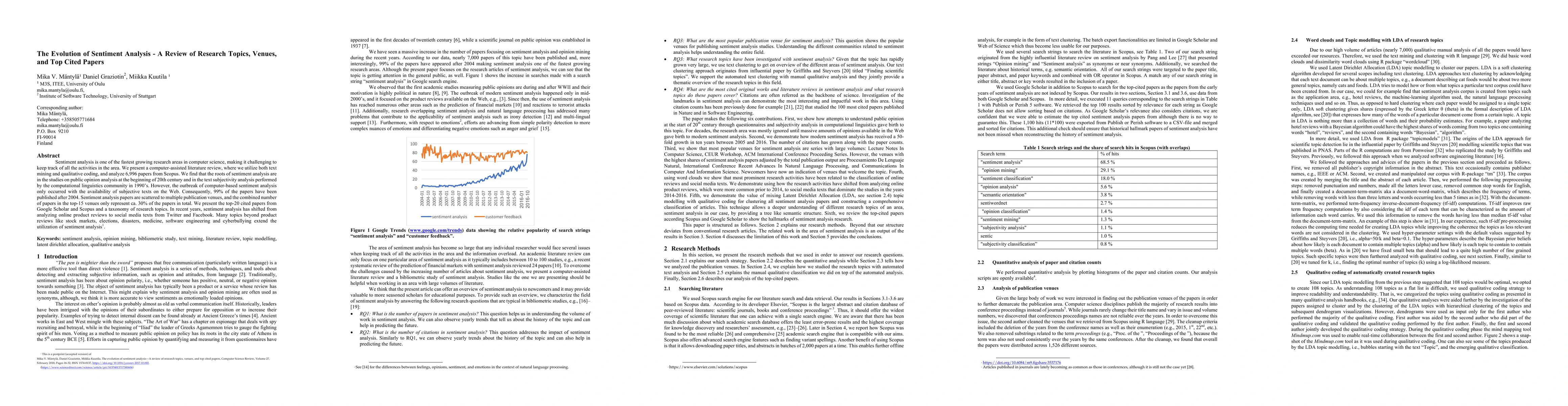 Sentiment analysis is one of the fastest growing research areas in computer science, making it challenging to keep track of all the activities in the area. We present a computer-assisted literature review, where we utilize both text mining and qualitative coding, and analyze 6,996 papers from Scopus. We find that the roots of sentiment analysis are in the studies on public opinion analysis at the beginning of 20th century and in the text subjectivity analysis performed by the computational linguistics community in 1990's. However, the outbreak of computer-based sentiment analysis only occurred with the availability of subjective texts on the Web. Consequently, 99% of the papers have been published after 2004. Sentiment analysis papers are scattered to multiple publication venues, and the combined number of papers in the top-15 venues only represent ca. 30% of the papers in total. We present the top-20 cited papers from Google Scholar and Scopus and a taxonomy of research topics. In recent years, sentiment analysis has shifted from analyzing online product reviews to social media texts from Twitter and Facebook. Many topics beyond product reviews like stock markets, elections, disasters, medicine, software engineering and cyberbullying extend the utilization of sentiment analysis