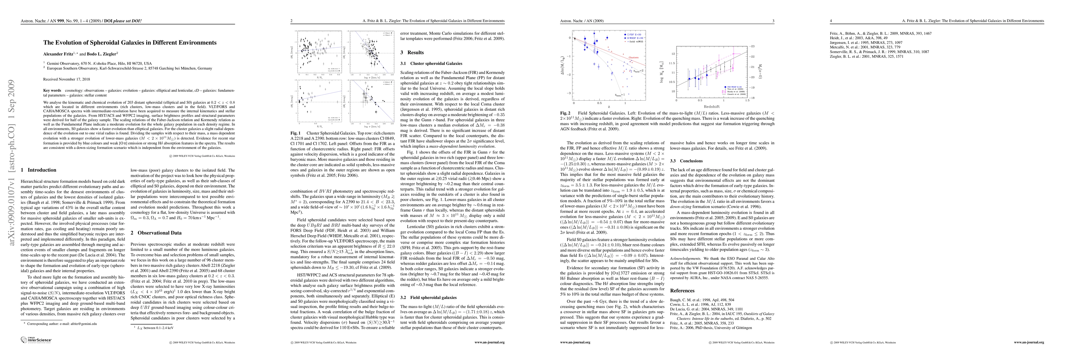 The study presents a detailed observational analysis of distant spheroidal galaxies in different environments, providing insights into their kinematic and chemical evolution.