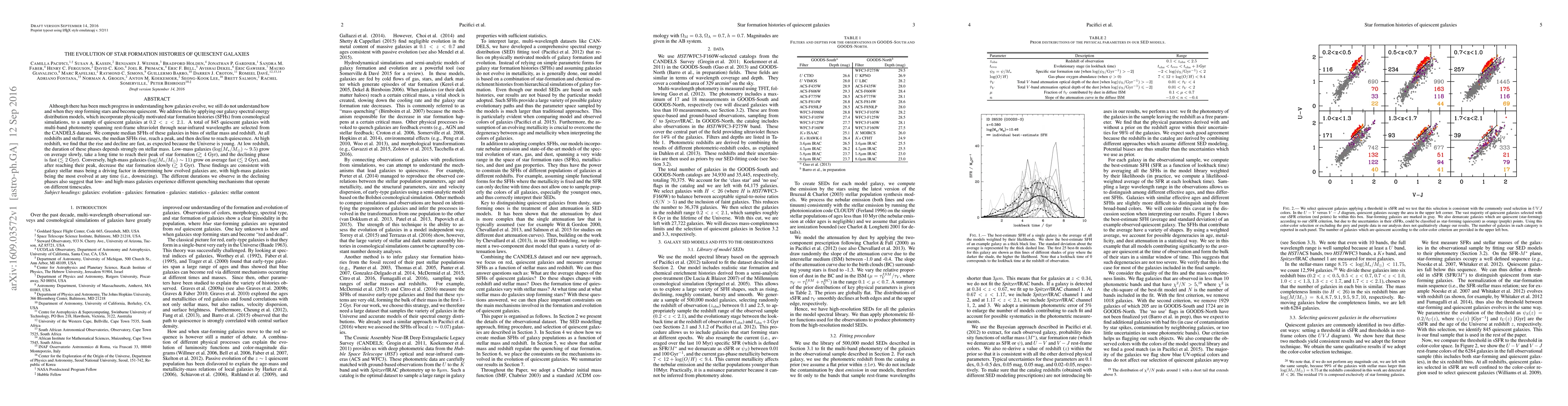 This study investigates the star formation histories (SFHs) of quiescent galaxies using galaxy spectral energy distribution models and a sample from the CANDELS dataset. The findings reveal that star formation peaks and declines differently for low-mass and high-mass galaxies, suggesting distinct quenching mechanisms and supporting the downsizing scenario.