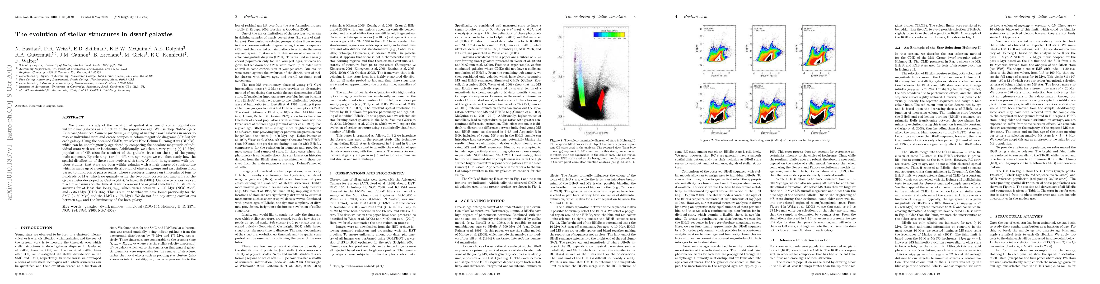We present a study of the variation of spatial structure of stellar populations within dwarf galaxies as a function of the population age. We use deep Hubble Space Telescope/Advanced Camera for Surveys imaging of nearby dwarf galaxies in order to resolve individual stars and create composite colour-magnitude diagrams (CMDs) for each galaxy. Using the obtained CMDs, we select Blue Helium Burning stars (BHeBs), which can be unambiguously age-dated by comparing the absolute magnitude of individual stars with stellar isochrones. Additionally, we select a very young (<10 Myr) population of OB stars for a subset of the galaxies based on the tip of the young main-sequence. By selecting stars in different age ranges we can then study how the spatial distribution of these stars evolves with time. We find, in agreement with previous studies, that stars are born within galaxies with a high degree of substructure which is made up of a continuous distribution of clusters, groups and associations from parsec to hundreds of parsec scales. These structures disperse on timescales of tens to hundreds of Myr, which we quantify using the two-point correlation function and the Q-parameter developed by Cartwright & Whitworth (2004). On galactic scales, we can place lower limits on the time it takes to remove the original structure (i.e., structure survives for at least this long), tevo, which varies between ~100~Myr (NGC~2366) and ~350 Myr (DDO~165). This is similar to what we have found previously for the SMC (~80~Myr) and the LMC (~175 Myr). We do not find any strong correlations between tevo and the luminosity of the host galaxy.
