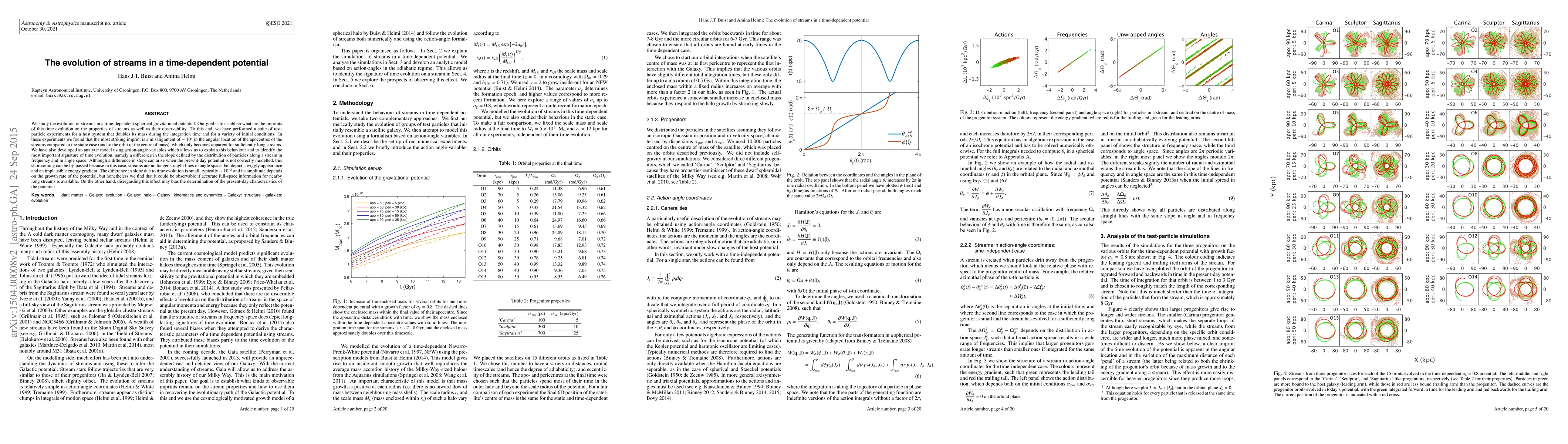 We study the evolution of streams in a time-dependent spherical gravitational potential. Our goal is to establish what are the imprints of this time evolution on the properties of streams as well as their observability. To this end, we have performed a suite of numerical experiments for a host system that doubles its mass during the integration time and for a variety of initial conditions. In these experiments we found that the most striking imprint is a misalignment of 10 degrees in the angular location of the apocentres of the streams compared to the static case (and to the orbit of the centre of mass), which only becomes apparent for sufficiently long streams. We have also developed an analytic model using action-angle variables which allows us to explain this behaviour and to identify the most important signature of time evolution, namely a difference in the slope defined by the distribution of particles along a stream in frequency and in angle space. Although a difference in slope can arise when the present-day potential is not correctly modelled, this shortcoming can be by-passed because in this case, streams are no longer straight lines in angle space, but depict a wiggly appearance and an implausible energy gradient. The difference in slope due to time-evolution is small, typically $\sim10^{-2}$ and its amplitude depends on the growth rate of the potential, but nonetheless we find that it could be observable if accurate full-space information for nearby long streams is available.