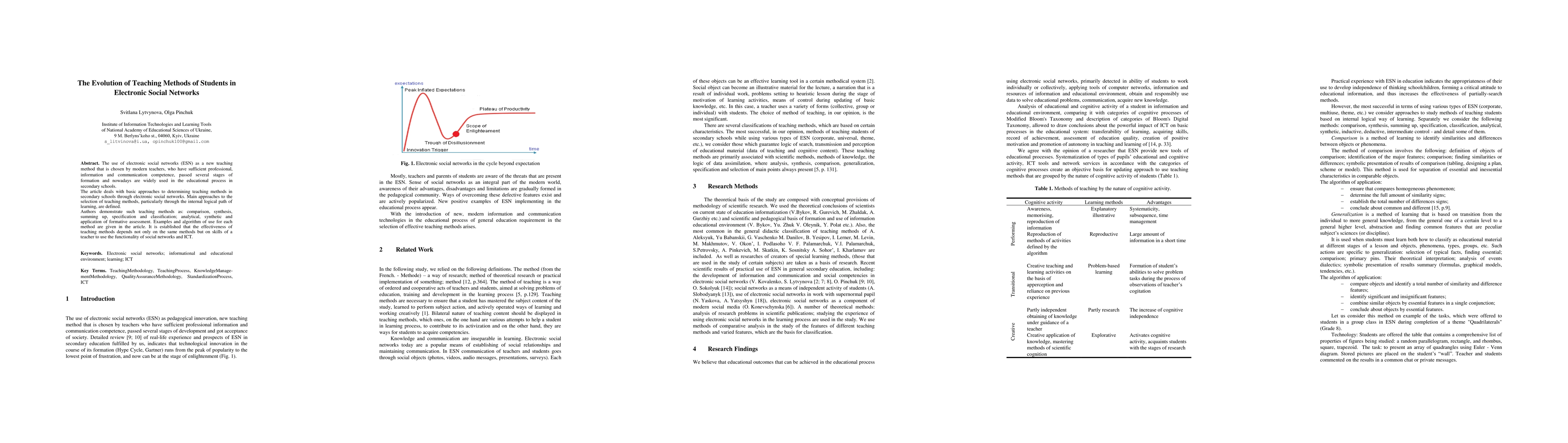 The use of electronic social networks (ESN) as a new teaching method that is chosen by modern teachers, who have sufficient professional, information and communication competence, passed several stages of formation and nowadays are widely used in the educational process in secondary schools. The article deals with basic approaches to determining teaching methods in secondary schools through electronic social networks. Main approaches to the selection of teaching methods, particularly through the internal logical path of learning, are defined. Authors demonstrate such teaching methods as: comparison, synthesis, summing up, specification and classification; analytical, synthetic and application of formative assessment. Examples and algorithm of use for each method are given in the article. It is established that the effectiveness of teaching methods depends not only on the same methods but on skills of a teacher to use the functionality of social networks and ICT.