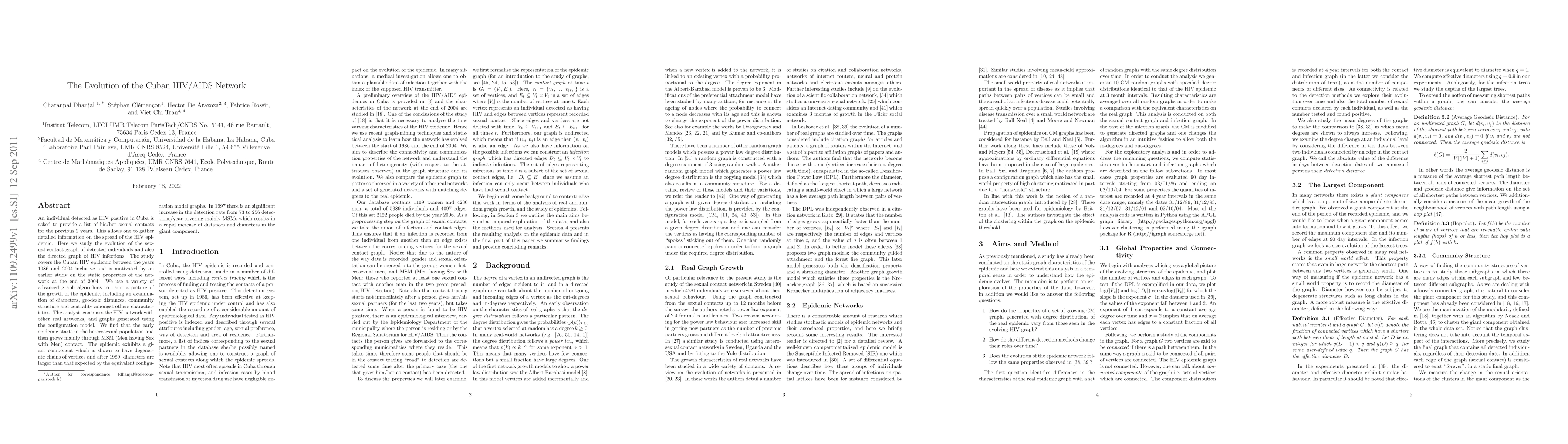 An individual detected as HIV positive in Cuba is asked to provide a list of his/her sexual contacts for the previous 2 years. This allows one to gather detailed information on the spread of the HIV epidemic. Here we study the evolution of the sexual contact graph of detected individuals and also the directed graph of HIV infections. The study covers the Cuban HIV epidemic between the years 1986 and 2004 inclusive and is motivated by an earlier study on the static properties of the network at the end of 2004. We use a variety of advanced graph algorithms to paint a picture of the growth of the epidemic, including an examination of diameters, geodesic distances, community structure and centrality amongst others characteristics. The analysis contrasts the HIV network with other real networks, and graphs generated using the configuration model. We find that the early epidemic starts in the heterosexual population and then grows mainly through MSM (Men having Sex with Men) contact. The epidemic exhibits a giant component which is shown to have degenerate chains of vertices and after 1989, diameters are larger than that expected by the equivalent configuration model graphs. In 1997 there is an significant increase in the detection rate from 73 to 256 detections/year covering mainly MSMs which results in a rapid increase of distances and diameters in the giant component.
