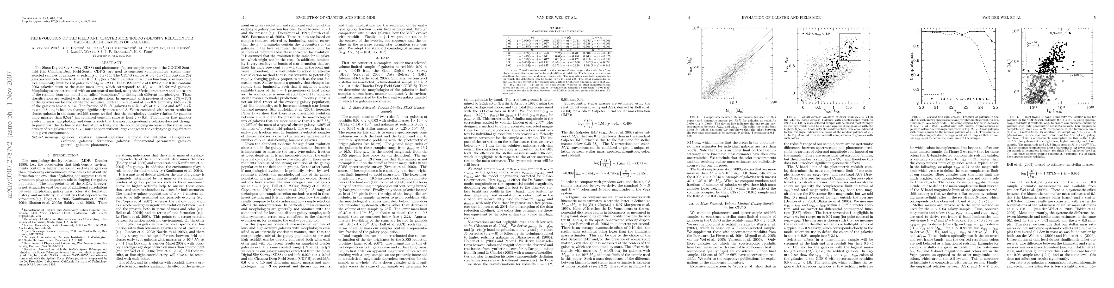 This paper examines the evolution of galaxy morphology and density relations in mass-selected samples from the SDSS and GOODS-South surveys. The study finds that the morphology-density relation for massive galaxies has remained constant since at least z~0.8, indicating that galaxies evolve in mass and density without significant changes in their early-type galaxy fraction.