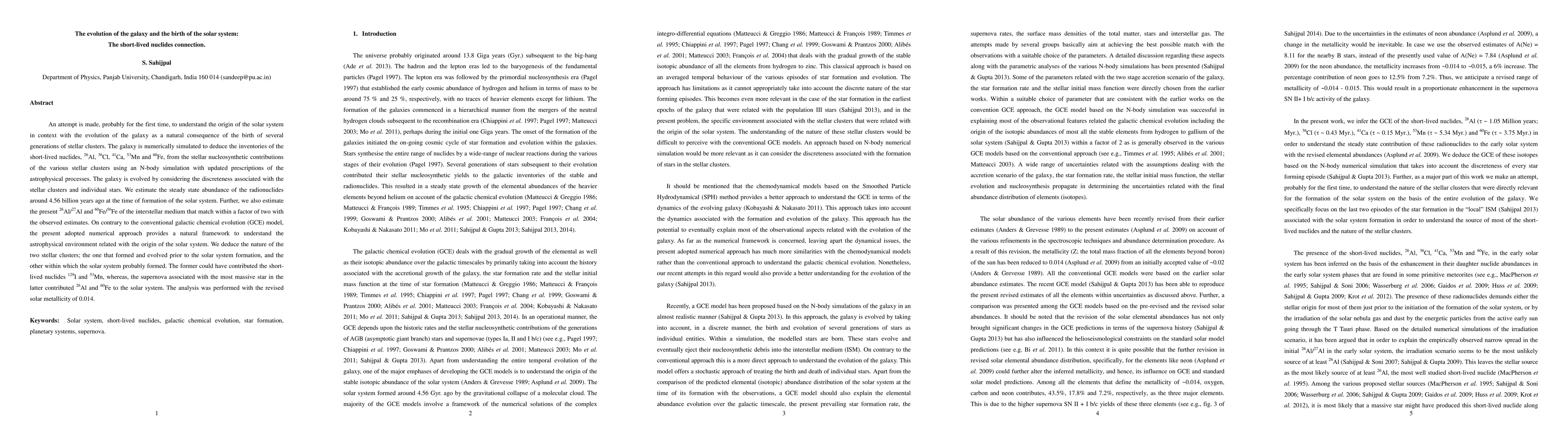 This paper simulates the galaxy's evolution to understand the origin of the solar system, focusing on the contributions of short-lived nuclides from stellar clusters. It estimates the abundance of these nuclides around 4.56 billion years ago, providing a framework that contrasts with conventional galactic chemical evolution models.