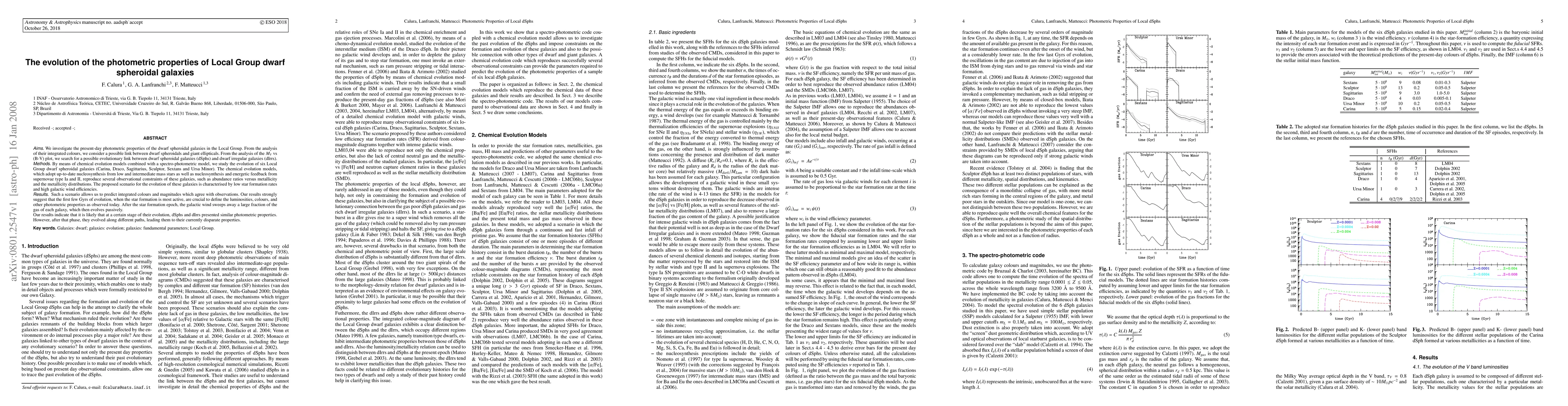 This paper examines the photometric properties and evolution of six Local Group dwarf spheroidal galaxies, finding that their early star formation and subsequent galactic winds shape their current photometric characteristics. It suggests a possible evolutionary link between these galaxies and dwarf irregular galaxies during their early stages.
