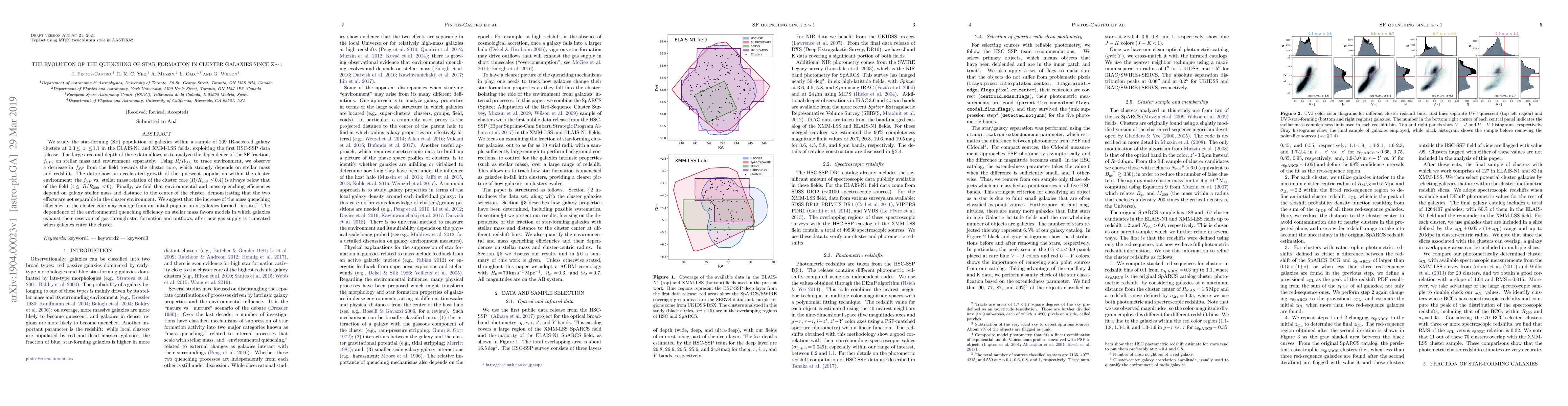We study the star-forming (SF) population of galaxies within a sample of 209 IR-selected galaxy clusters at 0.3$\,\leq\,z\,\leq\,$1.1 in the ELAIS-N1 and XMM-LSS fields, exploiting the first HSC-SSP data release. The large area and depth of these data allows us to analyze the dependence of the SF fraction, $f_{SF}$, on stellar mass and environment separately. Using $R/R_{200}$ to trace environment, we observe a decrease in $f_{SF}$ from the field towards the cluster core, which strongly depends on stellar mass and redshift. The data show an accelerated growth of the quiescent population within the cluster environment: the $f_{SF}$ vs. stellar mass relation of the cluster core ($R/R_{200}\,\leq\,$0.4) is always below that of the field (4$\,\leq\,R/R_{200}\,<\,$6). Finally, we find that environmental and mass quenching efficiencies depend on galaxy stellar mass and distance to the center of the cluster, demonstrating that the two effects are not separable in the cluster environment. We suggest that the increase of the mass quenching efficiency in the cluster core may emerge from an initial population of galaxies formed ``in situ.'' The dependence of the environmental quenching efficiency on stellar mass favors models in which galaxies exhaust their reservoir of gas through star formation and outflows, after new gas supply is truncated when galaxies enter the cluster.