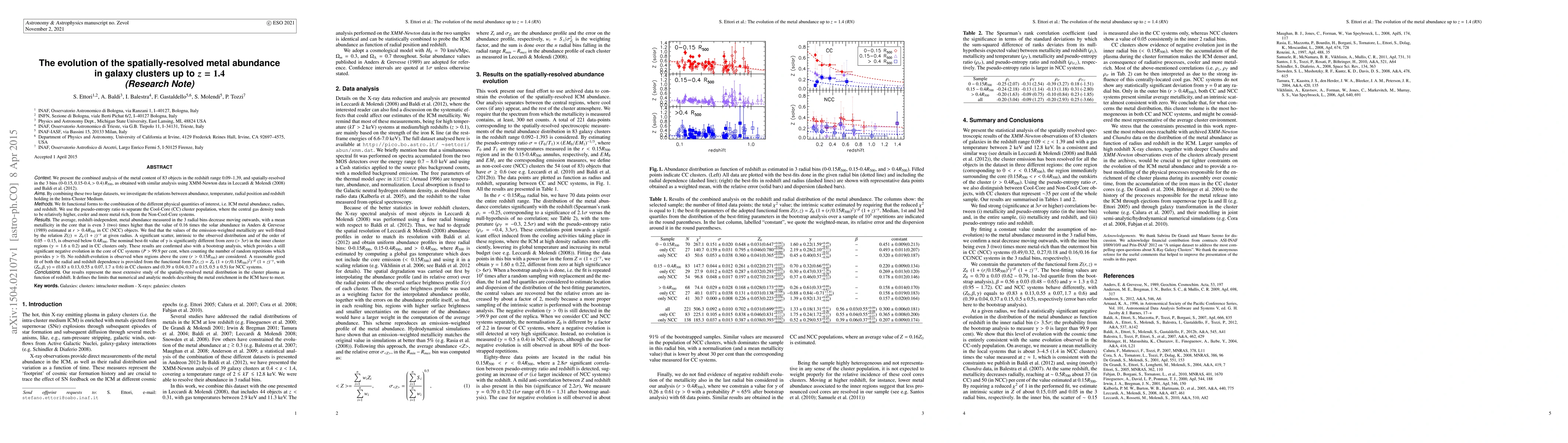 This paper analyzes the metal abundance in 83 galaxy clusters up to z=1.4, revealing that metal-rich regions are concentrated in the cluster cores, with a significant decrease in metallicity moving outward. The study shows a notable redshift-independent evolution in the central regions of Cool-Core clusters, fitting the relation $Z(z) = Z_0 (1+z)^{-\gamma}$ with $\gamma = 1.6 \pm 0.2$.