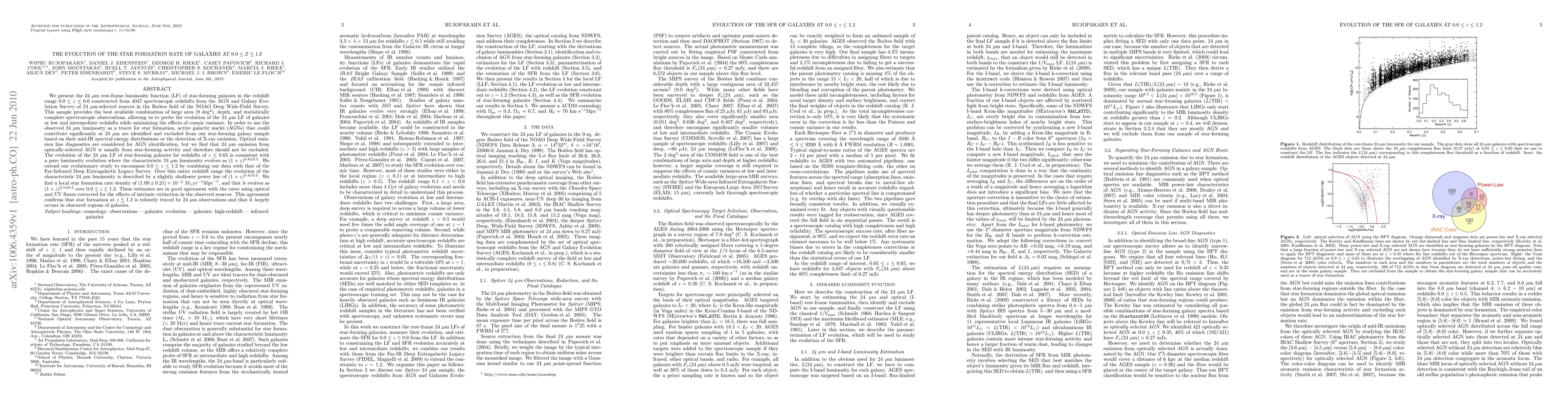 This paper investigates the evolution of star formation rates in galaxies from redshifts 0.0 < z < 1.2 using the 24 micron rest-frame luminosity function, finding a pure luminosity evolution and a star formation rate density that evolves as (1+z)^(3.5+/-0.2). The study confirms that 24 micron observations are robust tracers for star formation in obscured regions.