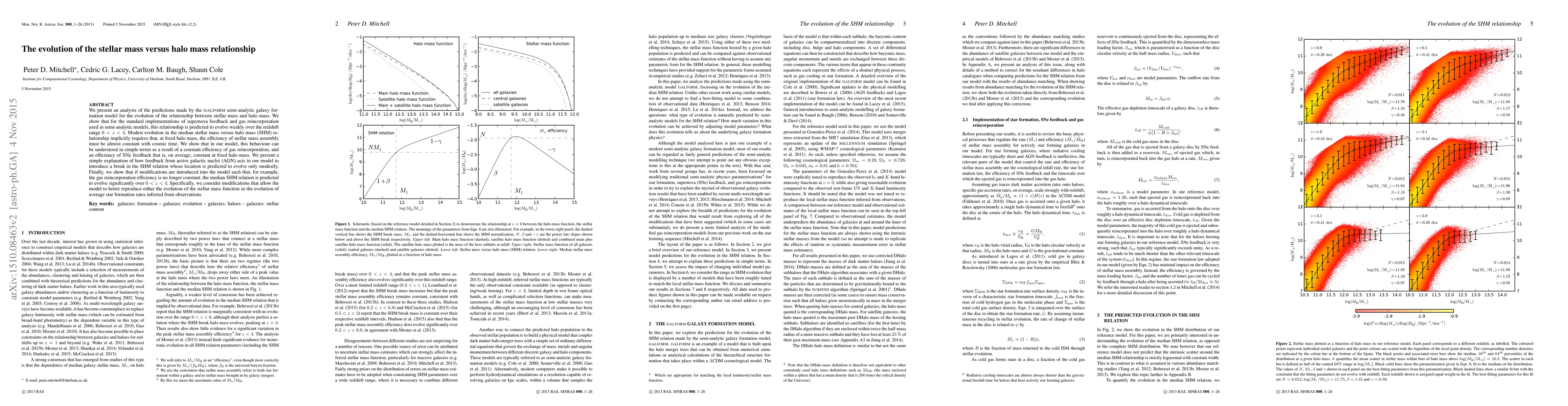 This paper analyzes the Galform semi-analytic galaxy formation model to show that the stellar mass versus halo mass relationship evolves weakly from redshift 0 to 4 due to constant gas reincorporation and supernova feedback efficiencies. Modifications to these efficiencies, however, could significantly alter this relationship.