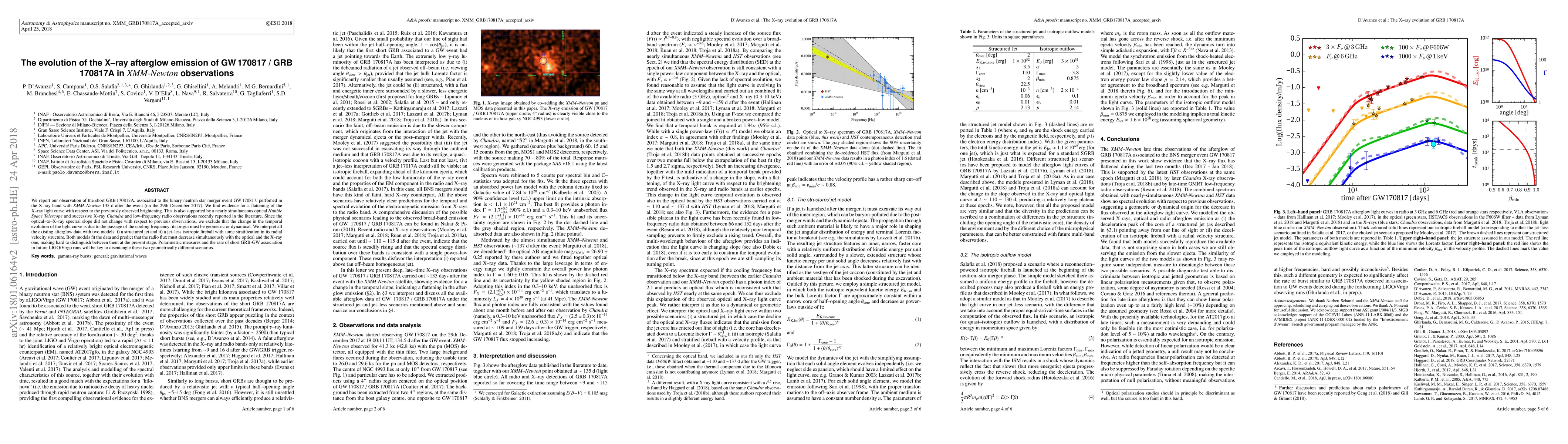 This paper reports on XMM-Newton observations of the X-ray afterglow of the short GRB 170817A, 135 days post-merger of GW 170817, revealing a flattening in the X-ray light curve. The authors propose that this change is geometric or dynamical rather than due to cooling frequency passage, and suggest two models to explain the data: a structured jet or a stratified jet-less isotropic fireball.