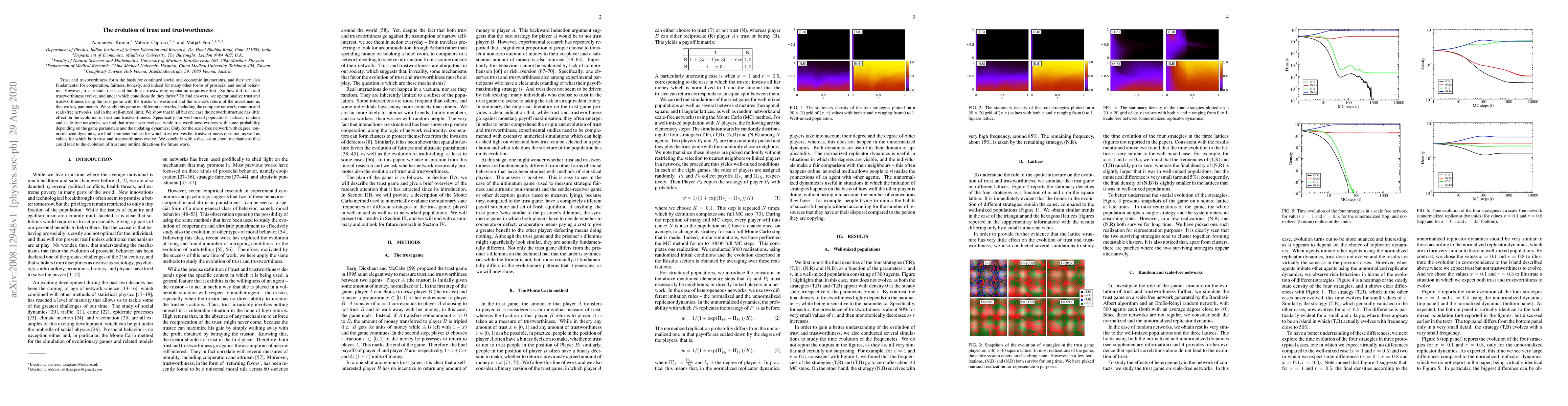 The paper explores the evolution of trust and trustworthiness across various network structures using a trust game. It finds that trust generally does not evolve, while trustworthiness does under certain conditions, with notable exceptions in scale-free networks where specific dynamics allow both trust and trustworthiness to evolve.