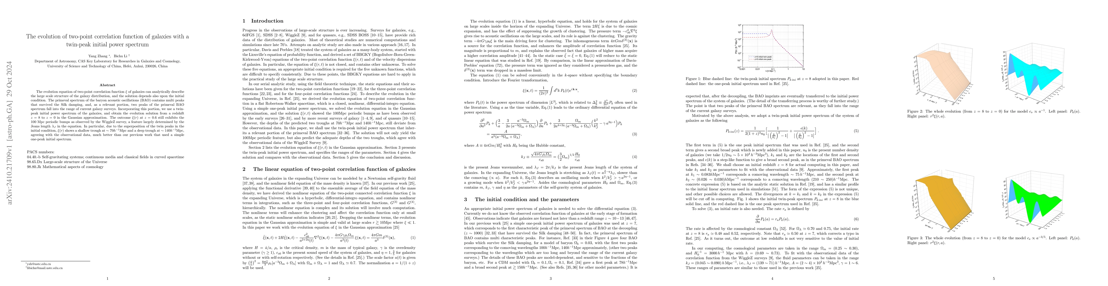This research investigates the evolution of the two-point correlation function $\xi$ of galaxies under a twin-peak initial power spectrum influenced by baryon acoustic oscillations (BAO). The analytical solution from redshift $z=8$ to $z=0$ reveals periodic bumps in $\xi(r)$ at $z=0.6$ that align with observational data from the WiggleZ survey, particularly the 100 Mpc features determined by the Jeans length. The twin-peak initial condition results in shallow and deep troughs in $\xi(r)$ that better match observations than a one-peak initial spectrum.