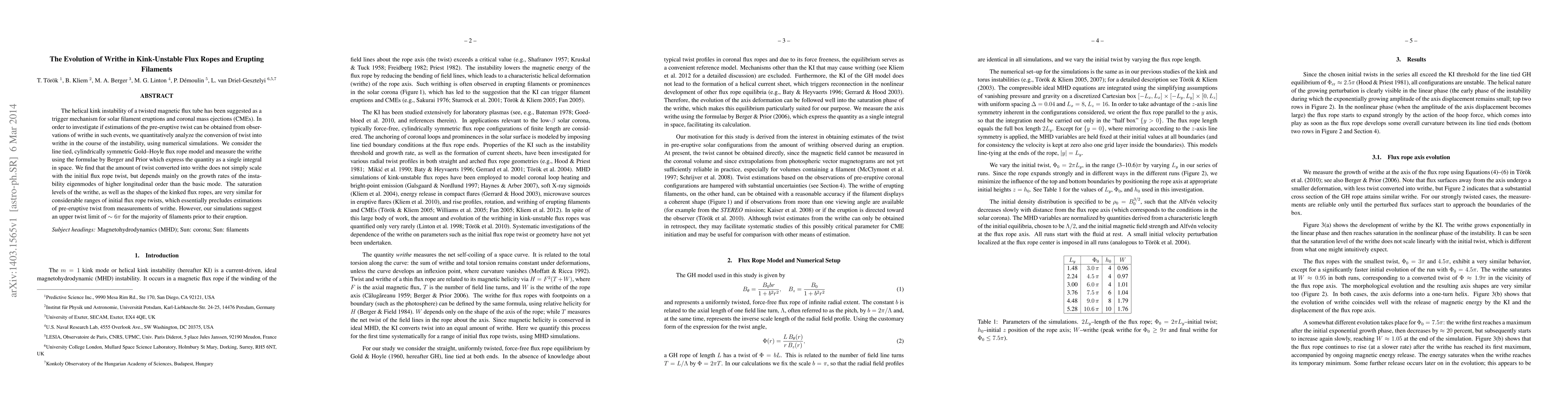 This paper investigates the helical kink instability of twisted magnetic flux ropes, finding that the twist conversion into writhe depends on higher-order instability modes rather than initial twist. It suggests that writhe measurements cannot reliably estimate pre-eruptive twist, but identifies an upper twist limit of approximately $6\pi$ for erupting filaments.