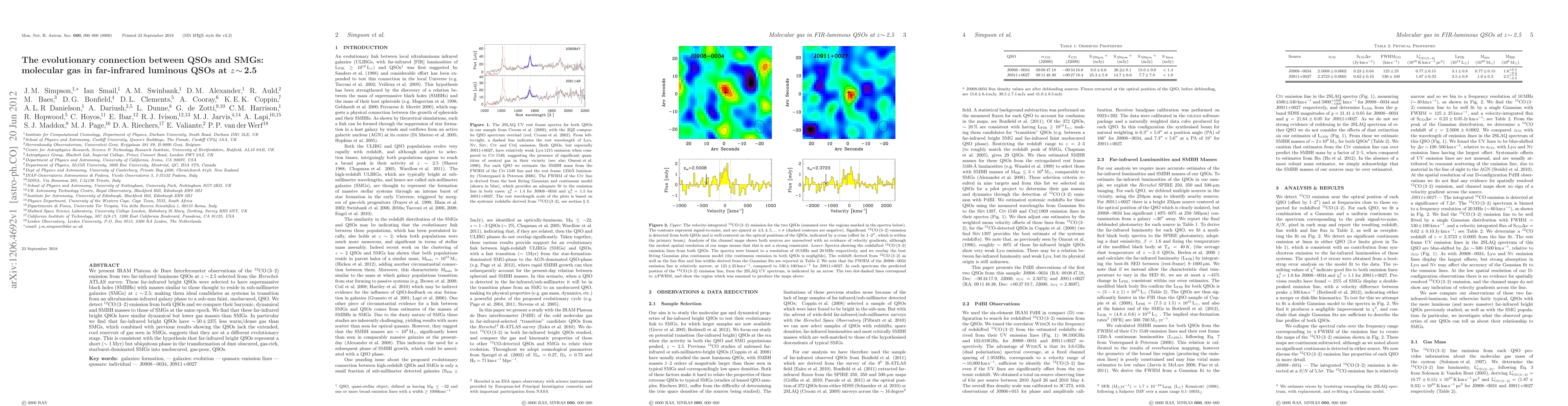 We present IRAM Plateau de Bure Interferometer observations of the 12CO(3-2) emission from two far-infrared luminous QSOs at z ~ 2.5 selected from the Herschel-ATLAS survey. These far-infrared bright QSOs were selected to have supermassive black holes (SMBHs) with masses similar to those thought to reside in sub-millimetre galaxies (SMGs) at z ~ 2.5; making them ideal candidates as systems in transition from an ultraluminous infrared galaxy phase to a sub-mm faint, unobscured, QSO. We detect 12CO(3-2) emission from both QSOs and we compare their baryonic, dynamical and SMBH masses to those of SMGs at the same epoch. We find that these far-infrared bright QSOs have similar dynamical but lower gas masses than SMGs. In particular we find that far-infrared bright QSOs have ~50+-23% less warm/dense gas than SMGs, which combined with previous results showing the QSOs lack the extended, cool reservoir of gas seen in SMGs, suggests that they are at a different evolutionary stage. This is consistent with the hypothesis that far-infrared bright QSOs represent a short (~1Myr) but ubiquitous phase in the transformation of dust obscured, gas-rich, starburst-dominated SMGs into unobscured, gas-poor, QSOs.