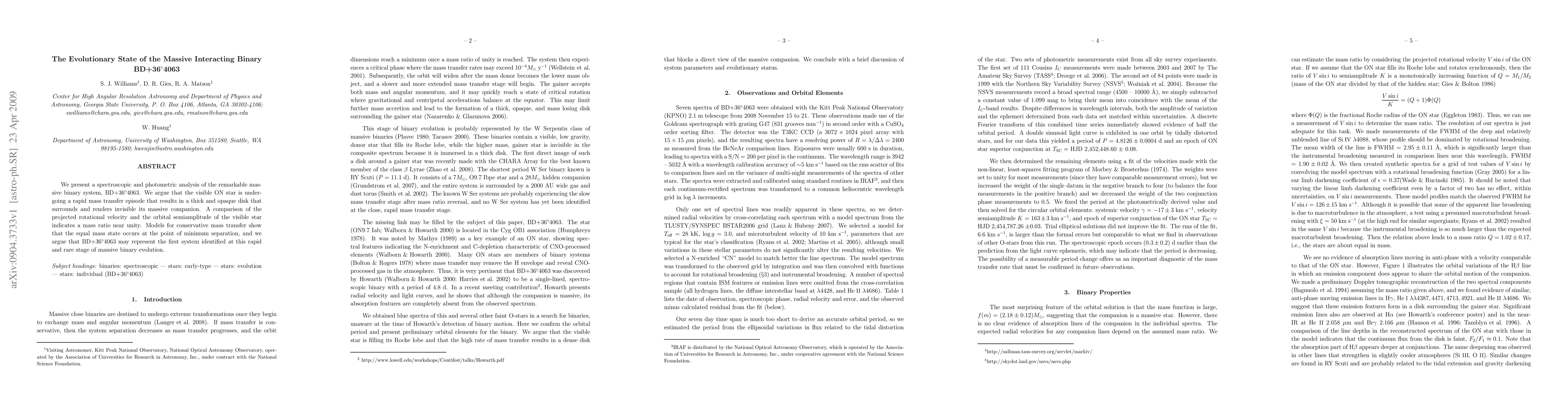 The research analyzes the massive binary system BD +36 4063, suggesting the visible star is experiencing rapid mass transfer to an opaque disk, hiding its massive companion. The study indicates a near-equal mass ratio and proposes BD +36 4063 may be the first identified system at this rare, rapid stage of massive binary evolution.