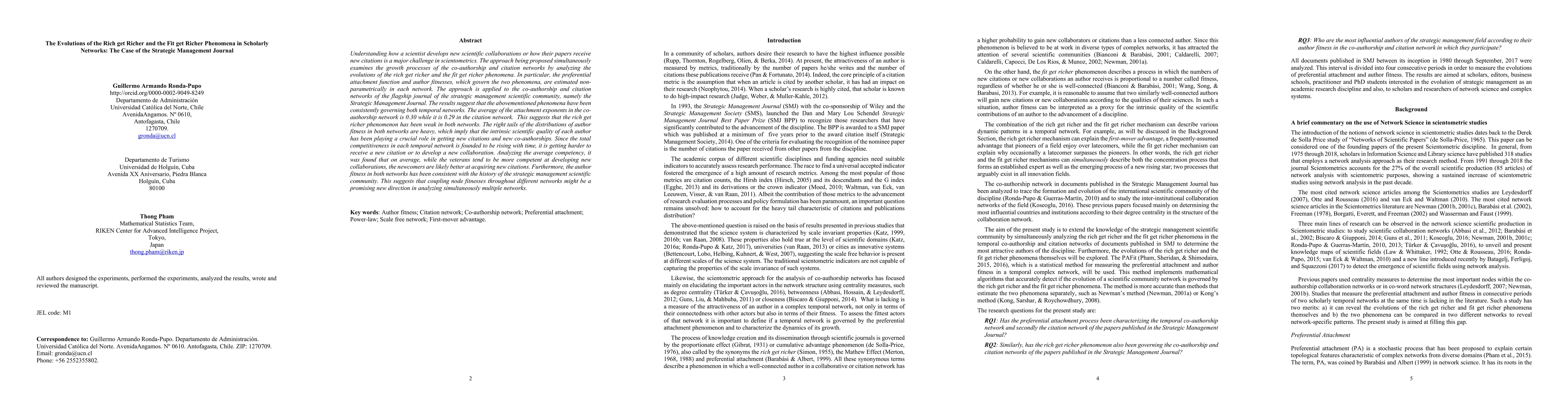 Understanding how a scientist develops new scientific collaborations or how their papers receive new citations is a major challenge in scientometrics. The approach being proposed simultaneously examines the growth processes of the co-authorship and citation networks by analyzing the evolutions of the rich get richer and the fit get richer phenomena. In particular, the preferential attachment function and author fitnesses, which govern the two phenomena, are estimated non-parametrically in each network. The approach is applied to the co-authorship and citation networks of the flagship journal of the strategic management scientific community, namely the Strategic Management Journal. The results suggest that the abovementioned phenomena have been consistently governing both temporal networks. The average of the attachment exponents in the co-authorship network is 0.30 while it is 0.29 in the citation network. This suggests that the rich get richer phenomenon has been weak in both networks. The right tails of the distributions of author fitness in both networks are heavy, which imply that the intrinsic scientific quality of each author has been playing a crucial role in getting new citations and new co-authorships. Since the total competitiveness in each temporal network is founded to be rising with time, it is getting harder to receive a new citation or to develop a new collaboration. Analyzing the average competency, it was found that on average, while the veterans tend to be more competent at developing new collaborations, the newcomers are likely better at acquiring new citations. Furthermore, the author fitness in both networks has been consistent with the history of the strategic management scientific community. This suggests that coupling node fitnesses throughout different networks might be a promising new direction in analyzing simultaneously multiple networks.