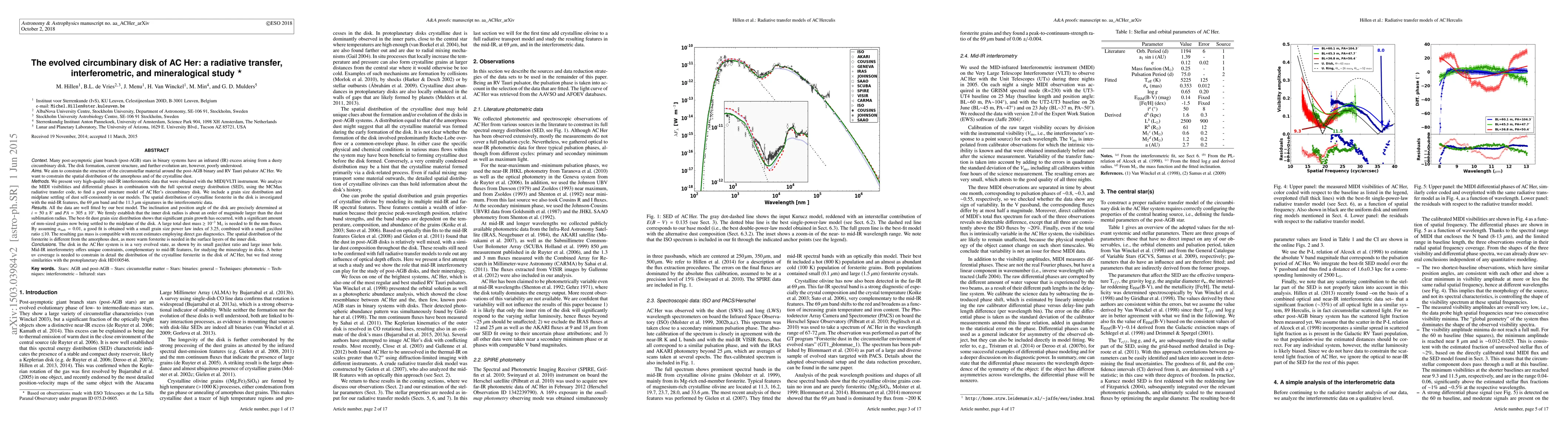 This study uses high-quality mid-IR interferometric data to model the evolved circumbinary disk around AC Her, revealing significant grain growth and a large inner disk radius. The analysis shows that mm-sized grains have settled to the midplane, and the spatial distribution of crystalline forsterite differs from amorphous dust, indicating an evolved disk with a small gas/dust ratio.