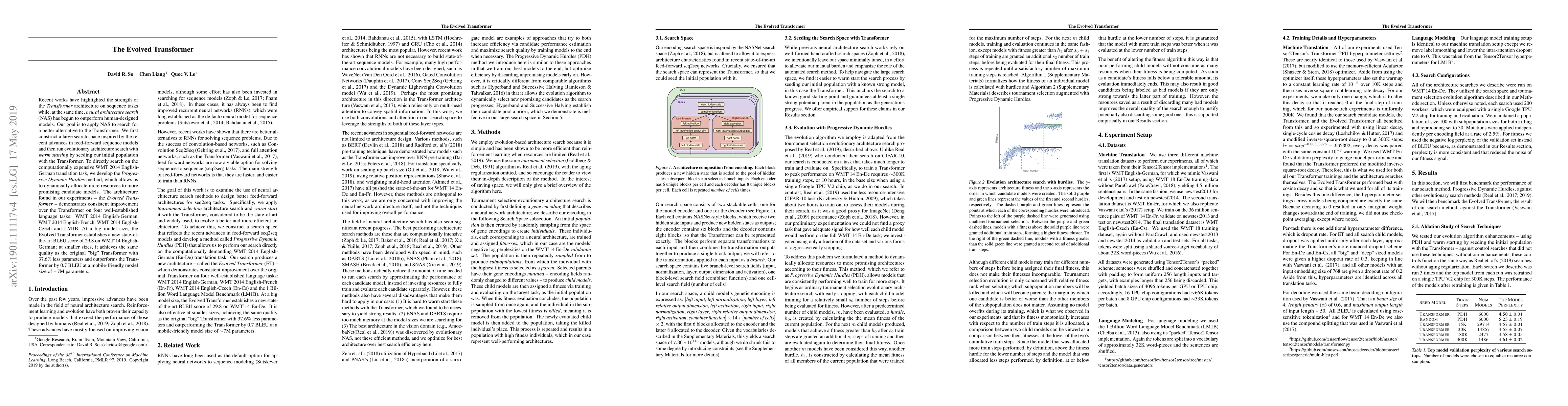 Researchers used neural architecture search to evolve a new transformer model that outperforms the original transformer on four language tasks, achieving state-of-the-art BLEU scores at various model sizes.