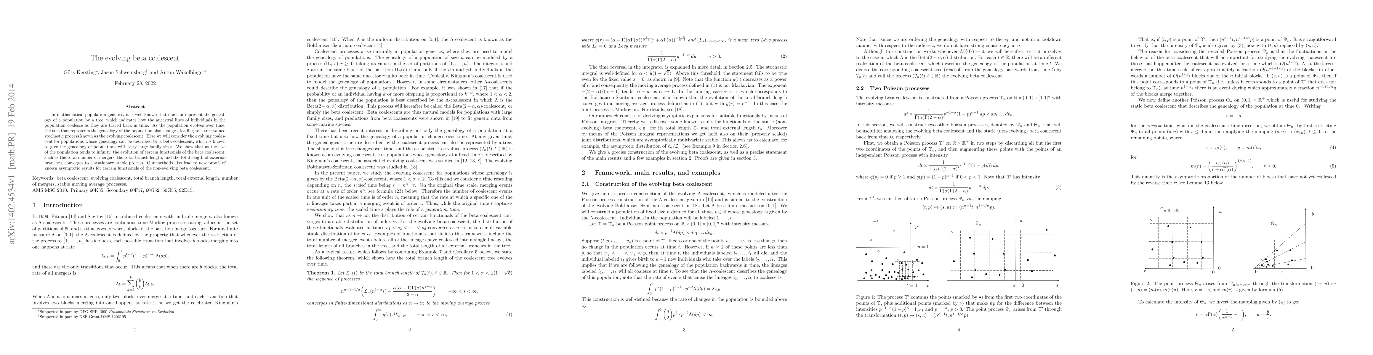 This paper investigates the evolving beta coalescent, a stochastic process representing the genealogy of populations with large family sizes. It demonstrates that as population size increases, functionals of the beta coalescent converge to a stable process, providing new proofs for known asymptotic results.