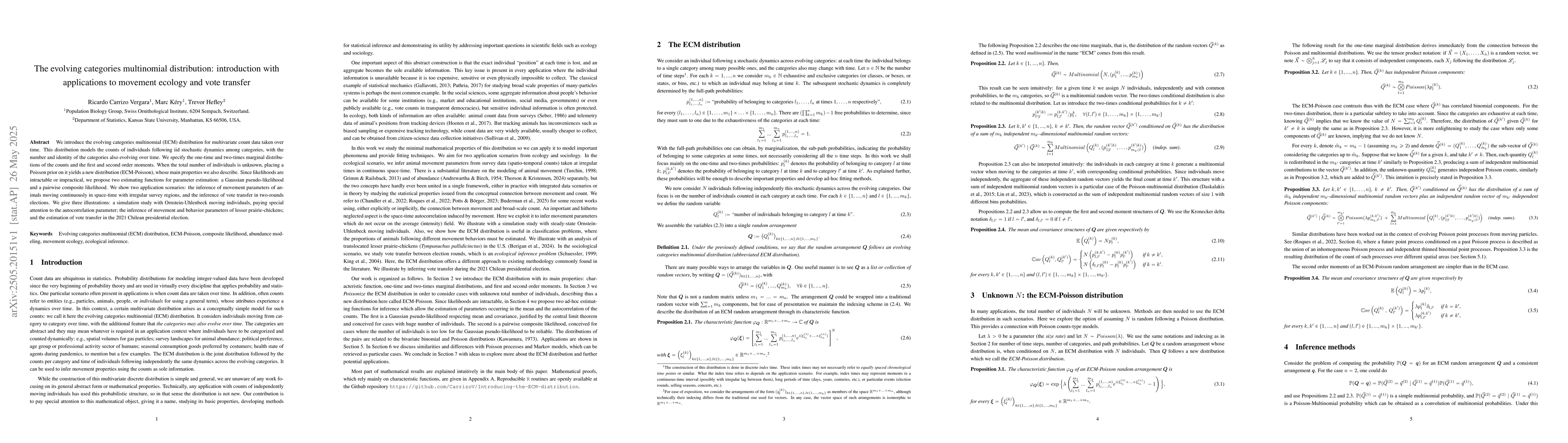 We introduce the evolving categories multinomial (ECM) distribution for multivariate count data taken over time. This distribution models the counts of individuals following iid stochastic dynamics among categories, with the number and identity of the categories also evolving over time. We specify the one-time and two-times marginal distributions of the counts and the first and second order moments. When the total number of individuals is unknown, placing a Poisson prior on it yields a new distribution (ECM-Poisson), whose main properties we also describe. Since likelihoods are intractable or impractical, we propose two estimating functions for parameter estimation: a Gaussian pseudo-likelihood and a pairwise composite likelihood. We show two application scenarios: the inference of movement parameters of animals moving continuously in space-time with irregular survey regions, and the inference of vote transfer in two-rounds elections. We give three illustrations: a simulation study with Ornstein-Uhlenbeck moving individuals, paying special attention to the autocorrelation parameter; the inference of movement and behavior parameters of lesser prairie-chickens; and the estimation of vote transfer in the 2021 Chilean presidential election.
