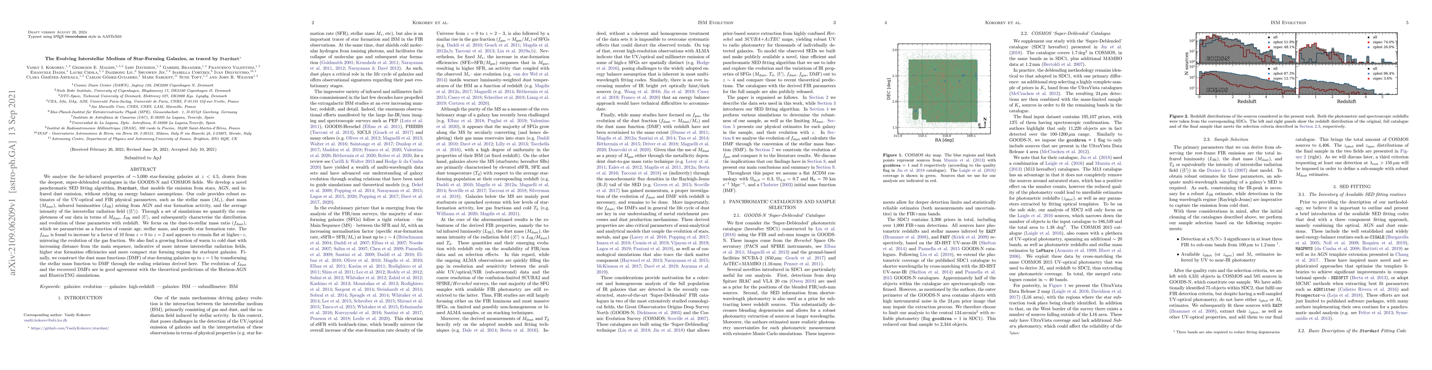 We analyse the far-infrared properties of $\sim$ 5,000 star-forming galaxies at $z<4.5$, drawn from the deepest, super-deblended catalogues in the GOODS-N and COSMOS fields. We develop a novel panchromatic SED fitting algorithm, $\texttt{Stardust}$, that models the emission from stars, AGN, and infrared dust emission, without relying on energy balance assumptions. Our code provides robust estimates of the UV-optical and FIR physical parameters, such as the stellar mass ($M_*$), dust mass ($M_{\rm dust}$), infrared luminosities ($L_{\rm IR}$) arising from AGN and star formation activity, and the average intensity of the interstellar radiation field ($\langle U \rangle$). Through a set of simulations we quantify the completeness of our data in terms of $M_{\rm dust}$, $L_{\rm IR}$ and $\langle U \rangle$, and subsequently characterise the distribution and evolution of these parameters with redshift. We focus on the dust-to-stellar mass ratio ($f_{\rm dust}$), which we parametrise as a function of cosmic age, stellar mass, and specific star formation rate. The $f_{\rm dust}$ is found to increase by a factor of 10 from $z=0$ to $z=2$ and appears to remain flat at higher$-z$, mirroring the evolution of the gas fraction. We also find a growing fraction of warm to cold dust with increasing distance from the main sequence, indicative of more intense interstellar radiation fields, higher star formation efficiencies and more compact star forming regions for starburst galaxies. Finally, we construct the dust mass functions (DMF) of star-forming galaxies up to $z=1$ by transforming the stellar mass function to DMF through the scaling relations derived here. The evolution of $f_{\rm dust}$ and the recovered DMFs are in good agreement with the theoretical predictions of the Horizon-AGN and IllustrisTNG simulations.