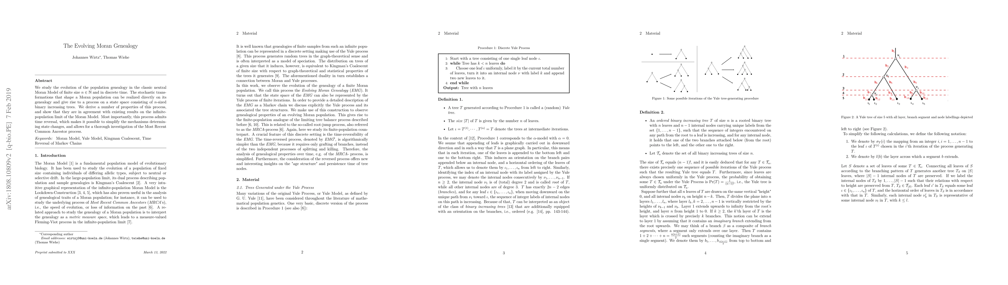 This paper investigates the population genealogy in the Moran Model, revealing a stochastic process on a finite set of Yule trees that mirrors the infinite-population limit. The study highlights the process's time-reversible nature, enabling detailed exploration of the Most Recent Common Ancestor.