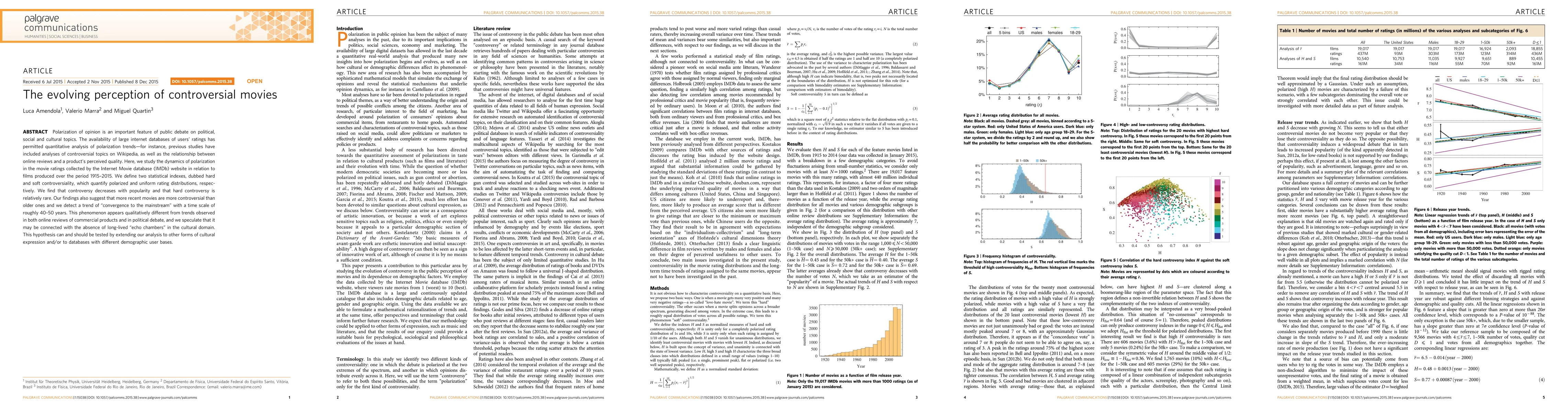 Polarization of opinion is an important feature of public debate on political, social and cultural topics. The availability of large internet databases of users' ratings has permitted quantitative analysis of polarization trends-for instance, previous studies have included analyses of controversial topics on Wikipedia, as well as the relationship between online reviews and a product's perceived quality. Here, we study the dynamics of polarization in the movie ratings collected by the Internet Movie database (IMDb) website in relation to films produced over the period 1915-2015. We define two statistical indexes, dubbed hard and soft controversiality, which quantify polarized and uniform rating distributions, respectively. We find that controversy decreases with popularity and that hard controversy is relatively rare. Our findings also suggest that more recent movies are more controversial than older ones and we detect a trend of "convergence to the mainstream" with a time scale of roughly 40-50 years. This phenomenon appears qualitatively different from trends observed in both online reviews of commercial products and in political debate, and we speculate that it may be connected with the absence of long-lived "echo chambers" in the cultural domain. This hypothesis can and should be tested by extending our analysis to other forms of cultural expression and/or to databases with different demographic user bases.