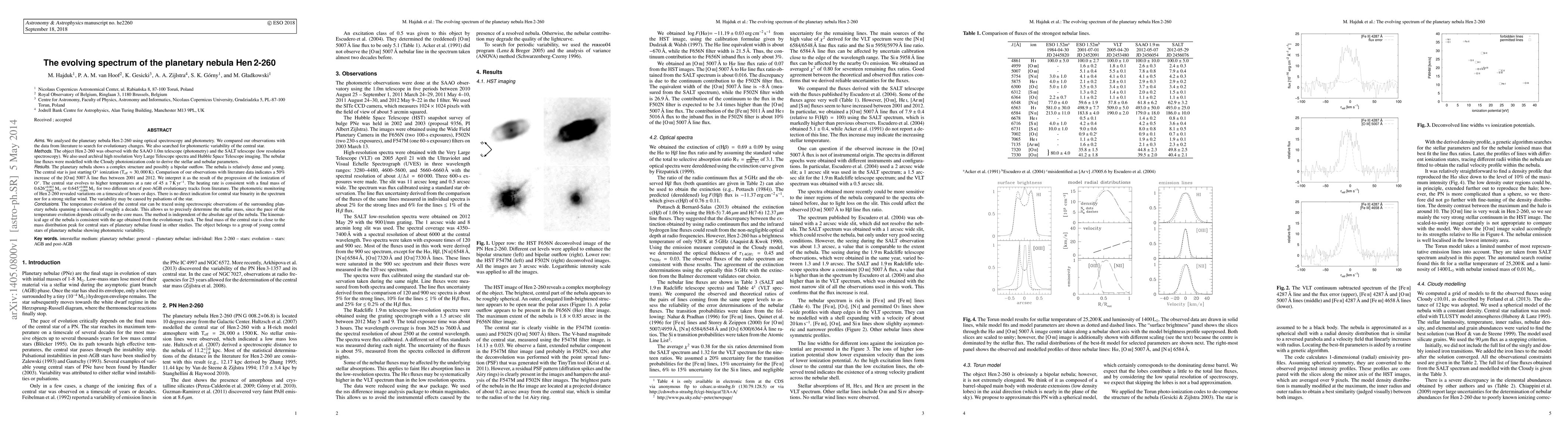 This study analyzes the planetary nebula Hen 2-260 using optical spectroscopy, revealing a complex structure and a 50% increase in [OIII] 5007 Å line flux over 11 years, indicative of evolving O+ ionization. The central star's temperature is rising at 45±7 K/yr, suggesting a final mass of 0.626–0.645 M☉.