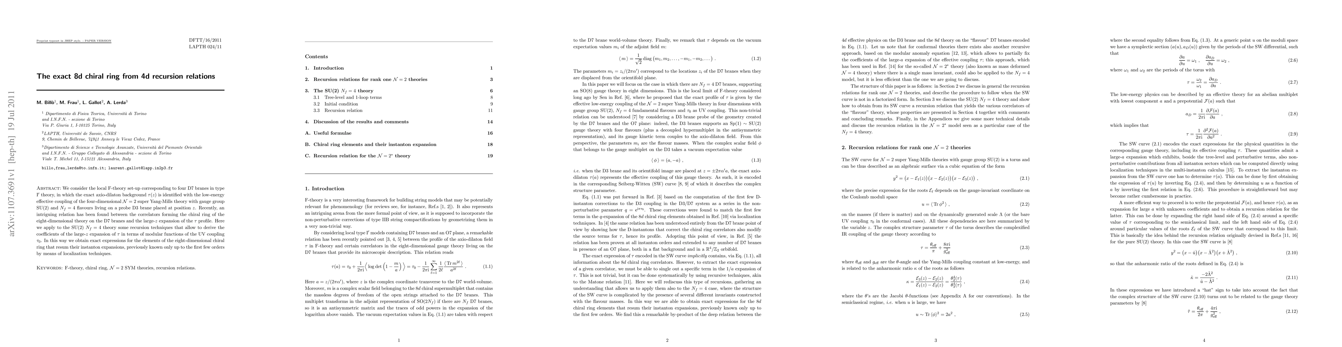 We consider the local F-theory set-up corresponding to four D7 branes in type I' theory, in which the exact axio-dilaton background tau(z) is identified with the low-energy effective coupling of the four-dimensional N=2 super Yang-Mills theory with gauge group SU(2) and Nf=4 flavours living on a probe D3 brane placed at position z. Recently, an intriguing relation has been found between the correlators forming the chiral ring of the eight-dimensional theory on the D7 branes and the large-z expansion of the tau profile. Here we apply to the SU(2), Nf=4 theory some recursion techniques that allow to derive the coefficients of the large-z expansion of tau in terms of modular functions of the UV coupling. In this way we obtain exact expressions for the elements of the eight-dimensional chiral ring that resum their instanton expansions, previously known only up to the first few orders by means of localization techniques.