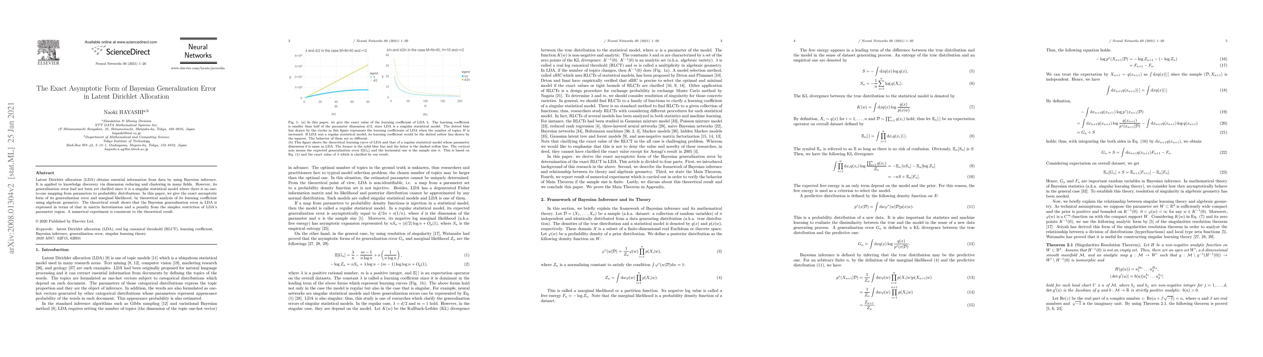 This paper provides the exact asymptotic form of the Bayesian generalization error for Latent Dirichlet Allocation (LDA) using theoretical analysis and algebraic geometry. The results show that LDA's generalization error combines matrix factorization error with a penalty due to the simplex constraint of its parameter space, validated by a numerical experiment.
