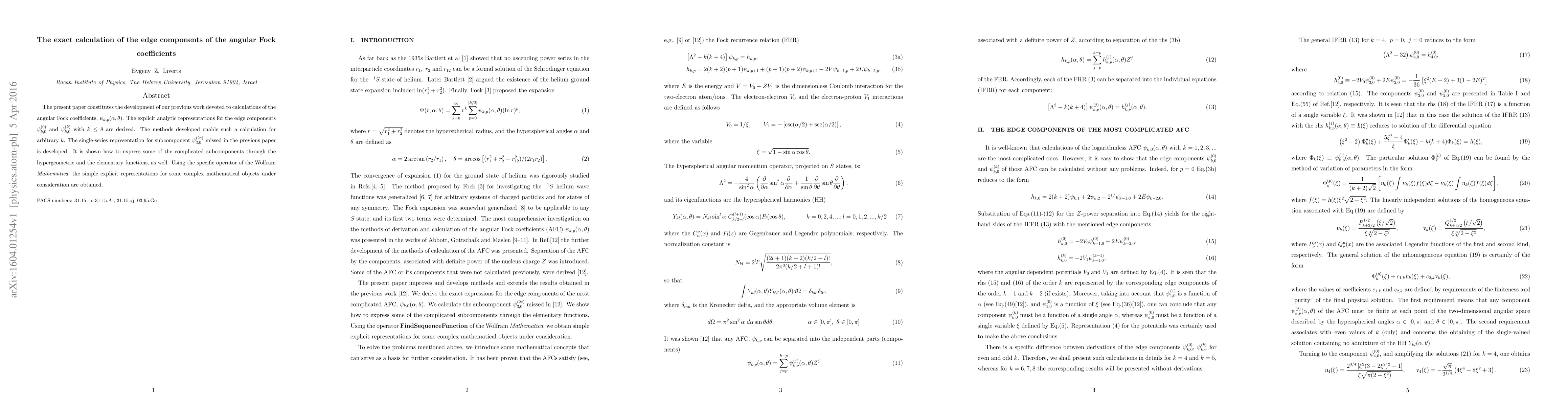 The present paper constitutes the development of our previous work devoted to calculations of the angular Fock coefficients, $\psi_{k,p}(\alpha,\theta)$. The explicit analytic representations for the edge components $\psi_{k,0}^{(0)}$ and $\psi_{k,0}^{(k)}$ with $k\leq8$ are derived. The methods developed enable such a calculation for arbitrary $k$. The single-series representation for subcomponent $\psi_{3,0}^{(2e)}$ missed in the previous paper is developed. It is shown how to express some of the complicated subcomponents through the hypergeometric and the elementary functions, as well. Using the specific operator of the Wolfram Mathematica, the simple explicit representations for some complex mathematical objects under consideration are obtained.