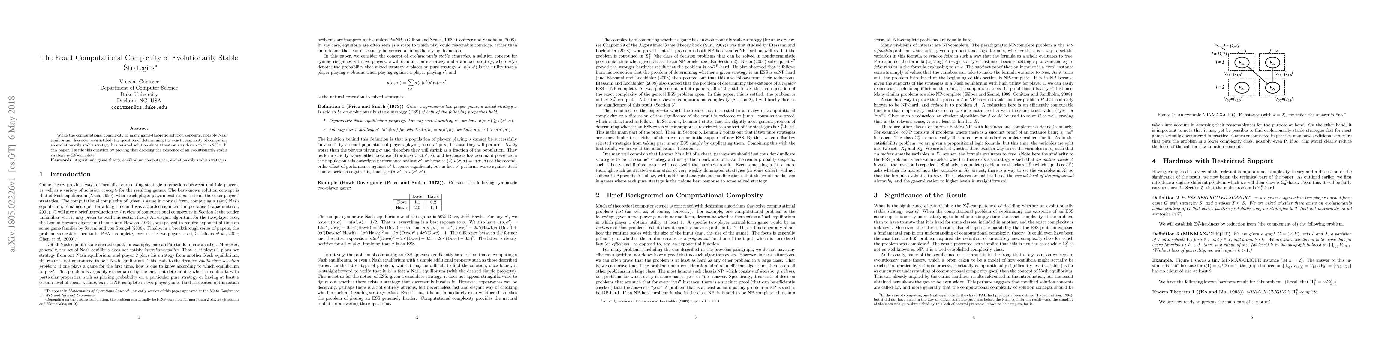 This paper resolves the long-standing computational complexity question of determining evolutionarily stable strategies, proving that deciding their existence is $\Sigma_2^P$-complete. This establishes the exact complexity for finding such strategies in evolutionary game theory.
