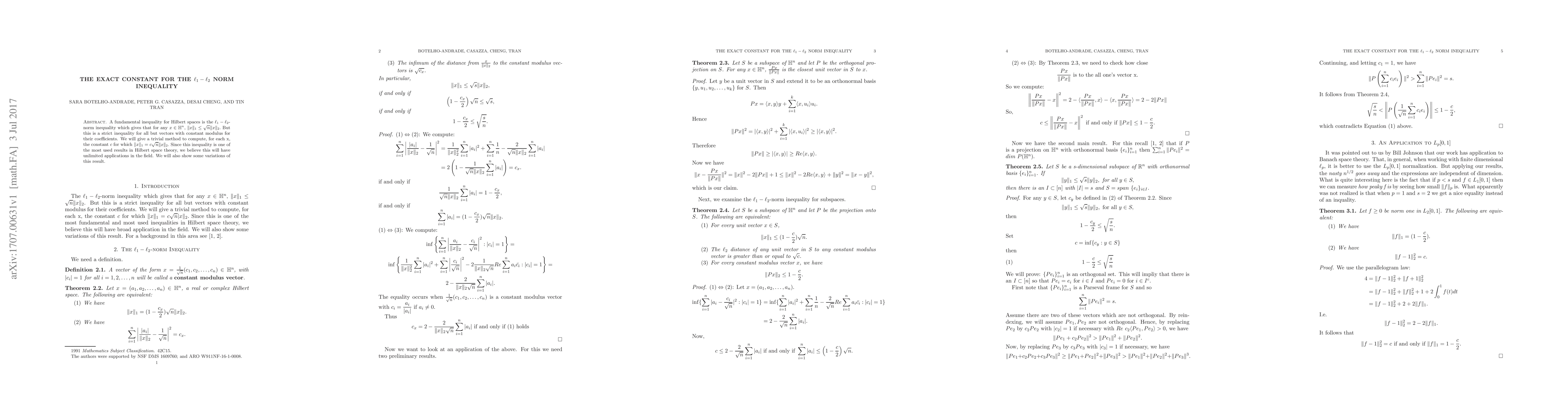 This paper finds a constant $c$ for the $ell_1-ell_2$ norm inequality in Hilbert spaces, allowing for an approximation of the strict inequality, with potential unlimited applications in the field.